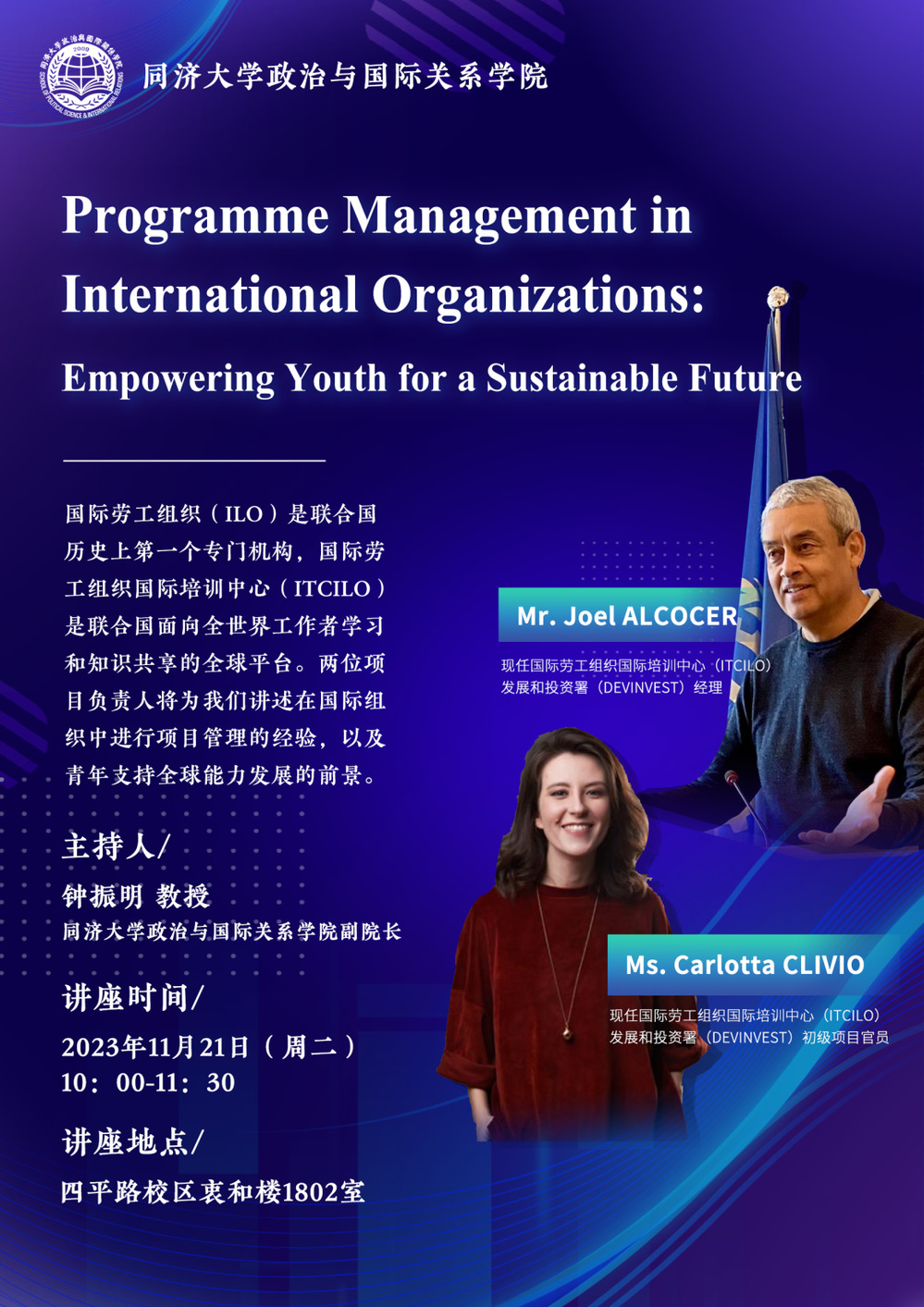 2023年11月21日,国际劳工组织国际培训中心主任乔尔·阿尔科萨先生(Joel ALCOCER)和初级项目官员李思璇女士(Carlotta CLIVIO)应邀访问同济大学星空足球并同我院部分师生展开交流。学院副院长钟振明教授主持了交流会,我院部分教师和本硕博学生参加交流。