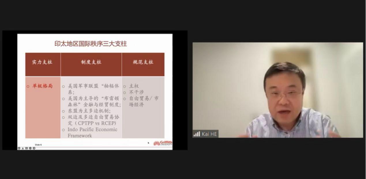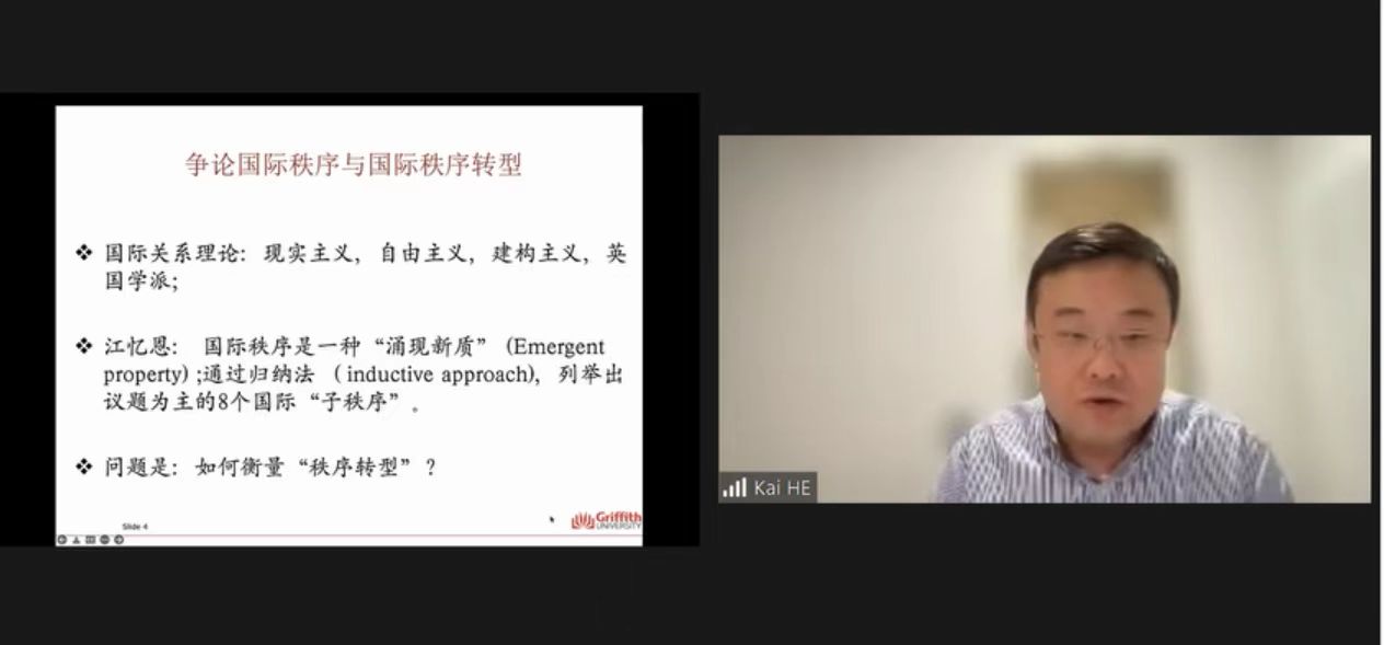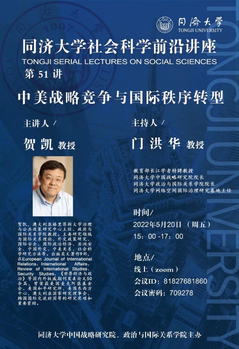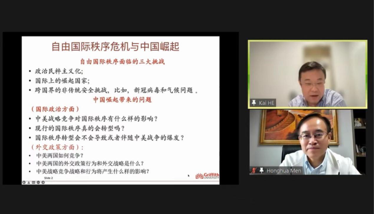 2022年5月20日下午,由同济大学中国战略研究院/星空足球主办的同济大学社会科学前沿讲座第51讲在线上成功举办。本次讲座邀请澳大利亚格里菲斯大学治理与公共政策研究中心主任、政府与国际关系学院贺凯教授作题为“中美战略竞争与国际秩序转型”的主题演讲。本次讲座由教育部长江特聘教授门洪华院长主持,同济大学校内外共110余名师生参加了此次线上学术讲座。