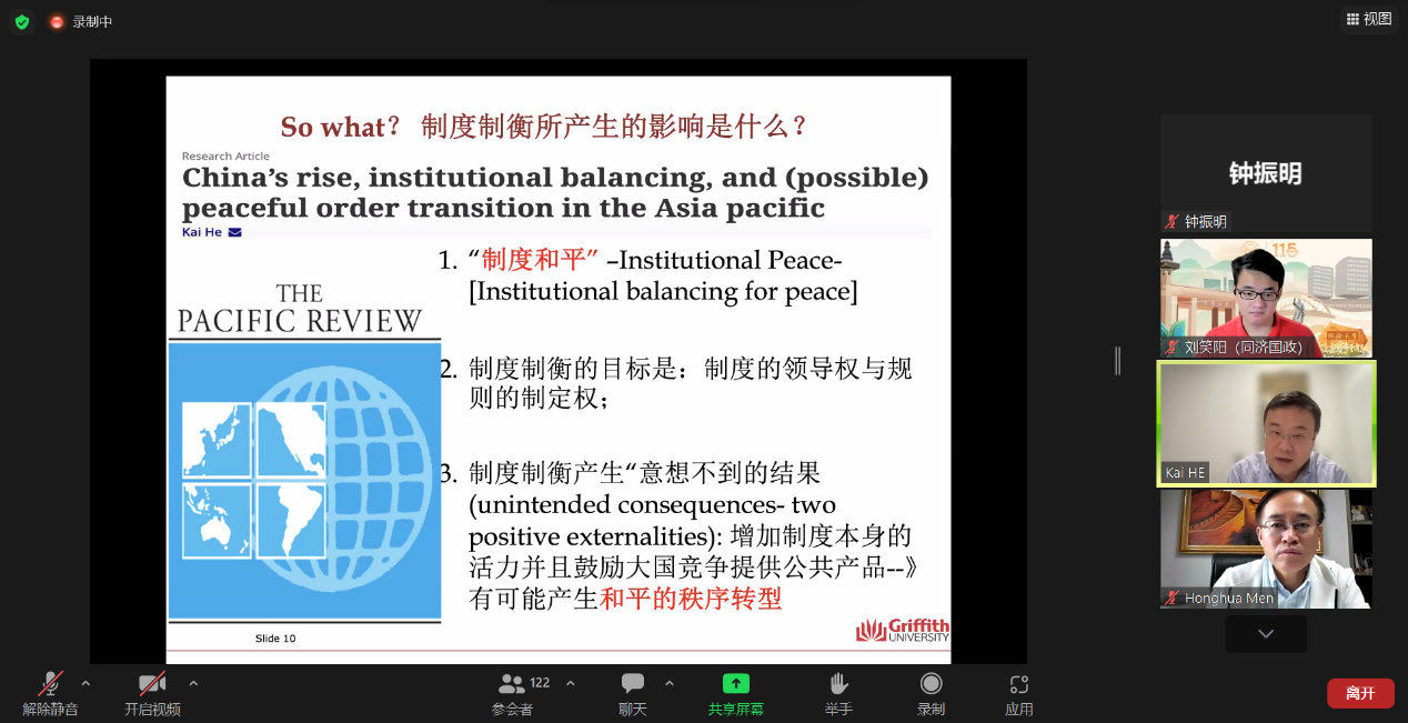 主题演讲之后,贺凯教授与同济师生们进行积极互动,在线上回答了同济师生们的提问,就主权规范在规范支柱中的合理性、三大支柱之间的关系、西方学者对中国是否是国际秩序挑战者的不同观点、保持中美战略稳定、中美在经贸方面的走向、应对未来可能发生的中美制度脱钩、制度的自主性作用、国际秩序转型与竞争激化之间的因果关系等问题进行了细致入微的解答。