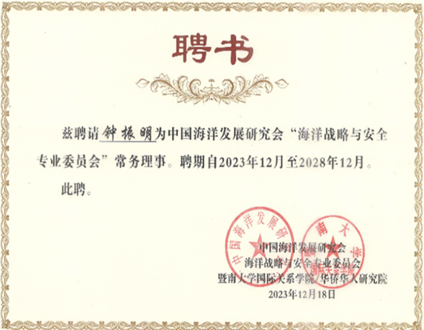 2023年12月20-21日,中国海洋发展研究会海洋战略与安全专业委员会换届大会暨“中国周边安全与南海和平”高端论坛在广州举行,会议由中国海洋发展研究会海洋战略与安全专业委员会、暨南大学国际关系学院/华侨华人研究院联合主办。来自全国各地高校和研究单位的专家代表100多人参加会议,同济大学中国战略研究院/星空足球门洪华院长出席,学院副院长钟振明教授和博士后宋国新等参加了论坛会议交流。