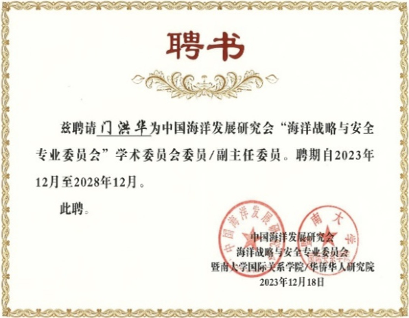 在12月20日召开的中国海洋发展研究会海洋战略与安全专业委员会换届大会上,同济大学中国战略研究院当选中国海洋发展研究会海洋战略与安全专业委员会副理事长单位,门洪华教授当选中国海洋发展研究会海洋战略与安全专业委员会副理事长和学术委员会副主任委员,钟振明教授当选常务理事兼副秘书长,宋国新博士后当选理事。