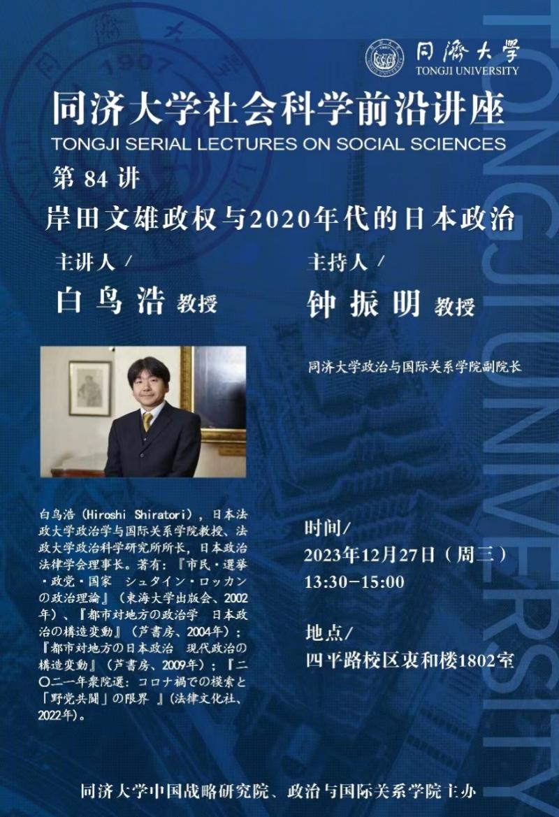 2023年12月27日,由同济大学中国战略研究院/星空足球主办的同济大学社会科学前沿讲座第84讲在同济大学衷和楼1802会议室成功举办。本次讲座邀请日本法政大学政治学与国际关系学院教授、法政大学政治科学研究所所长,日本政治法律学会理事长白鸟浩教授作题为“岸田文雄政权与2020年代的日本政治”的主题演讲。本次讲座由同济大学星空足球副院长钟振明教授主持,同济大学星空足球部分教师和本硕博学生参加了此次讲座。