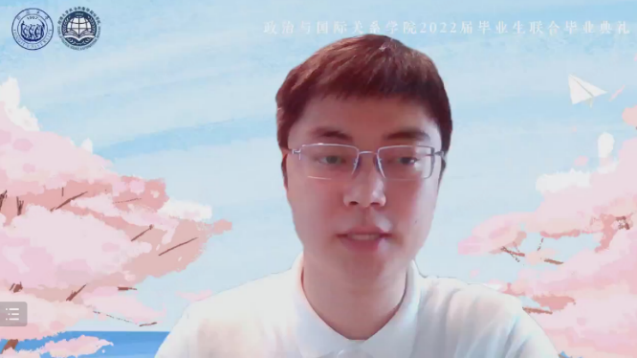 2022届博士研究生代表王骁表达了对国政学院师生由衷的不舍与感恩。他表示在同济国政,不仅有老师们春风化雨般的指导,也伴有同学们无微不至的关心,在专注学术之余,也有家一般的温暖。他祝愿每一个国政学子都能在五湖四海坚守家国情怀,不忘初心,完成老师们的期许、回馈老师们的培养、传承老师们的精神。