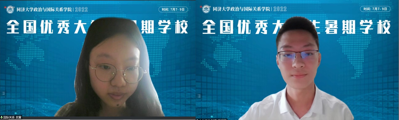 山东大学的吴萱同学和南开大学的鲍润南同学作为学员代表在开幕式上发言。吴萱同学表示,感谢同济大学星空足球提供的平台与机会,来自五湖四海的学员们因对国际政治学科的共同热爱而在此聚首,相信同济大学国政学院暑期学校活动定能给同学们留下美好深刻的回忆;面对未来深远变革,国关学子更应该有“志当存高远,敢为天下先”的胸怀与气魄,衷心希望能与本次夏令营优秀的同辈们切磋交流,共同学习,也预祝同济大学2022年夏令营顺利举办。鲍润南同学表示,同济政治学交叉学科研究的特色深具吸引力,感谢同济大学国政学院创造这个交流学习机会,希望通过本次暑期学校的学习,能够增长专业知识,激发学术热情,期望在未来能够来到同济大学校园,亲身体验同济“与祖国同行,以科教济世”的优良传统。