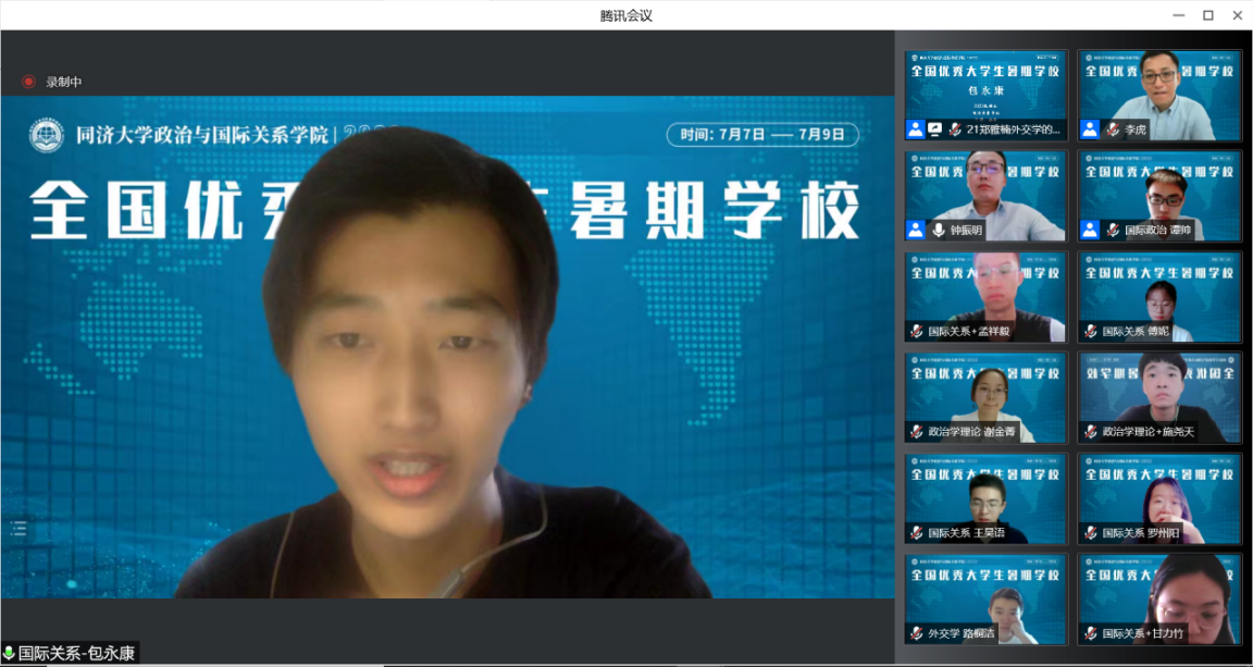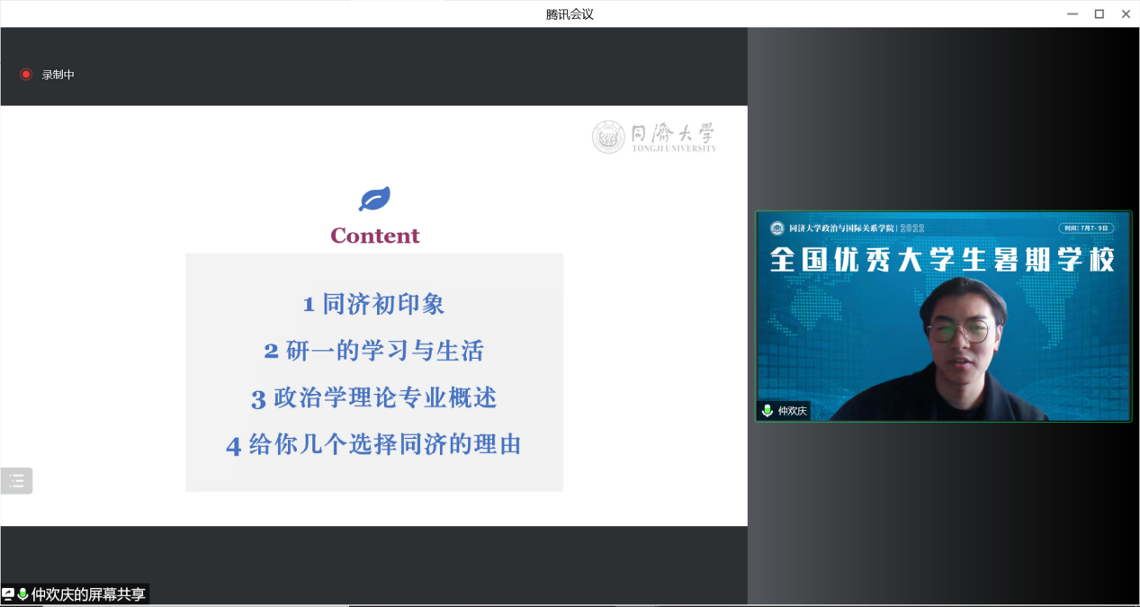 仲欢庆同学结合自身对同济的初印象以及一年来的切身感受,向参加暑期学校的各位学员们讲解了自己学在同济的感悟、分享了同济不可辜负的美食与美景、丰富的研究资料、优良的学风,同时也介绍了自己对政治学专业的看法与学习心得,以图文并茂的方式进行耐心细致的讲解,展示了选择同济、选择国政学院的诸多理由。