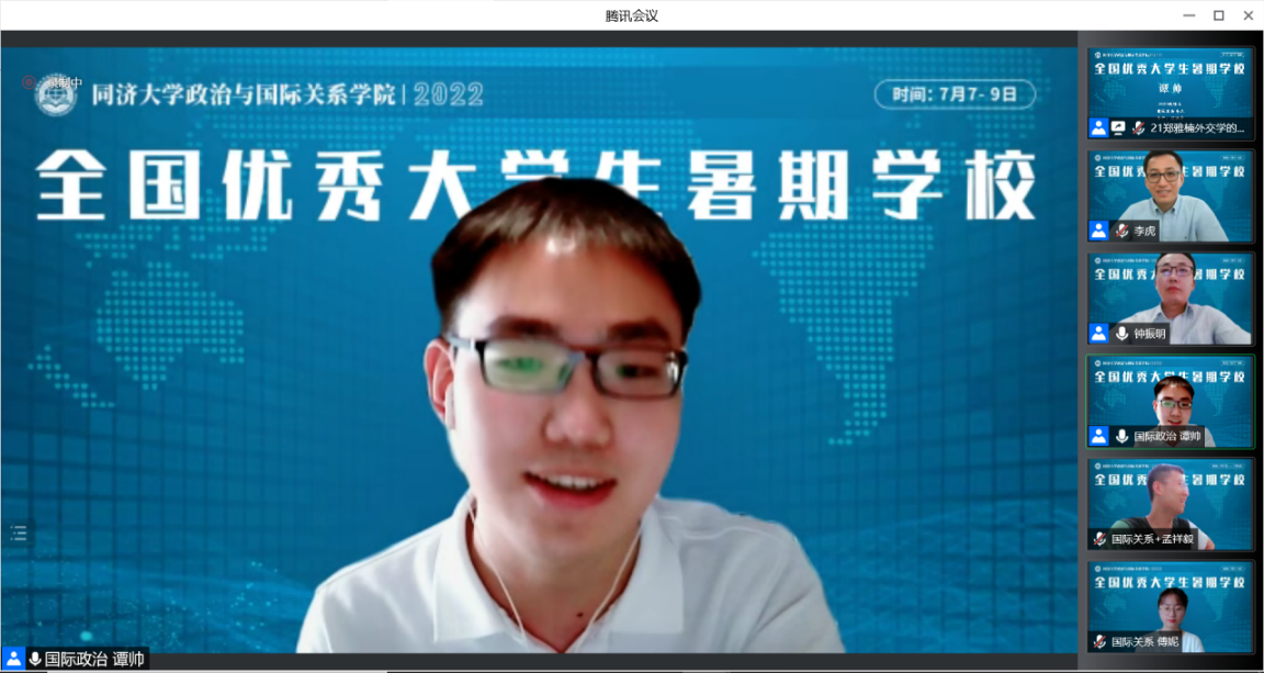 谭帅同学分享了在同济大学国政学院两年来学习生活的经历与体验。谭帅同学基于自己的学习体悟为学员介绍了学院的课程体系与特色:学员们将会在《中国国际战略研究》课程中感受战略的高度,在《国际政治理论专题》《国际组织与国际合作》等课程中探索理论的深度,在《政治哲学专题》《西方外交思想史》等课程中体悟历史的厚度。谭帅同学还系统地向学员们梳理了学院研究生期间的重要节点与规划,并期待于明年九月与各位优秀的学员们在美丽的同济校园相见。