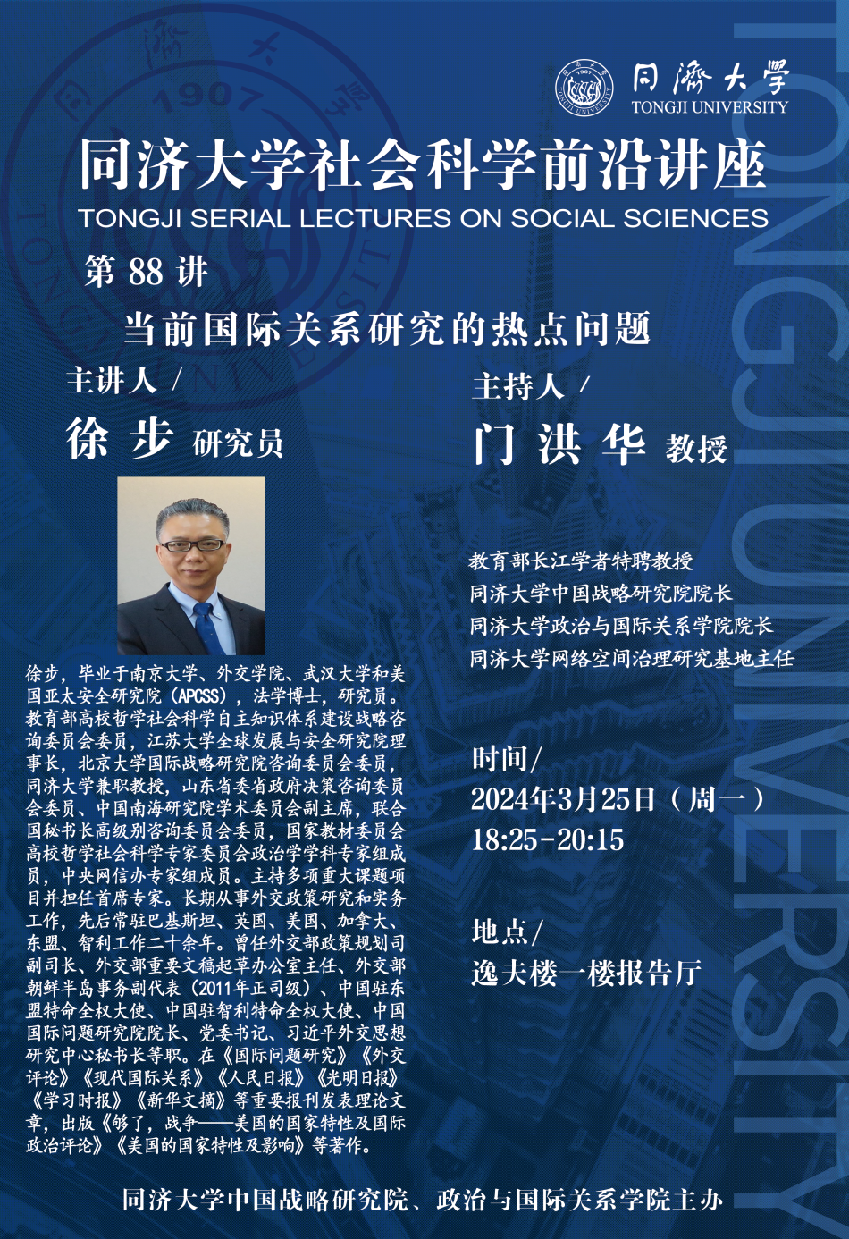 2024年3月25日,由同济大学中国战略研究院/星空足球主办的同济大学2024年度校级高等讲堂第68讲、同济大学社会科学前沿讲座第88讲在同济大学逸夫楼一楼报告厅成功举办。本次讲座邀请中国国际问题研究院原党委书记兼院长、习近平外交思想研究中心前秘书长、中国外交部朝鲜半岛事务原副代表、中国原驻东盟使团团长兼大使、中国原驻智利大使徐步作题为“当前国际关系研究的热点问题”的主题演讲。本次讲座由教育部长江学者特聘教授门洪华院长主持,同济大学教师、博士生、硕士生300余人参加了此次讲座。