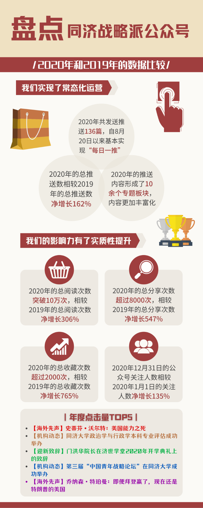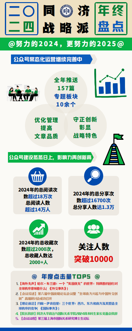 在宣传平台方面,同济大学中国战略研究院主持的“同济战略派”公众号在2024年团队不断壮大、运营稳步推进。2024年全年推送157篇文章,通过10余个内容丰富的专题板块坚持中国风格、彰显战略特色。据统计,2024“同济战略派”关注人数突破1万人、总阅读量超过18万次、总阅读人数超过14万人、总分享人数达1.3万。回望2024年,同济战略派步履铿锵。展望2025年,同济战略派踔厉奋发,力争打造“中国本位、战略特色”的宣传平台。