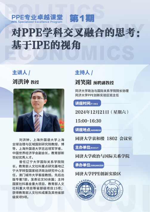 20241221日,同济大学PPE专业卓越课堂第1期成功举办,“同济大学PPE专业卓越课堂”旨在培育卓越型战略人才(特别是具有哲学抽象思维的融通政治与经济关系的学术/实践精英)的第二课堂,基于“同济战略学派”的学术品牌打造形成交叉人才培养的思想平台与创新路径。本次卓越课堂邀请上海外国语大学志远领军学者刘洪钟教授以PPE学科交叉融合的思考:基于IPE的视角”为题,为在场30余名同济学子(特别是同济大学PPE方向本科生)进行权威讲授,课堂由同济大学PPE创新实验区班主任刘笑阳预聘副教授主持。刘洪钟教授基于政治和经济之间的学科联系,系统梳理了国际政治经济学的发展进程,开启了探讨国际政治的“互惠”和国际经济的“共惠”的创新视野,体现出政治研究与经济研究在深度思维层面上的交叉融合。