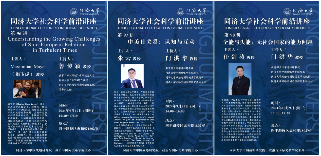 919日,德国波恩大学梅飞虎(Maximilian Mayer)教授受邀开展以“Understanding the Growing Challenges of Sino-European Relations in Turbulent Times”为主题的讲座,就俄乌冲突对中欧关系的影响、中美“新冷战”对欧洲产业与贸易政策牵连问题,以及欧洲去风险化政策的有效性等问题展开详细讲述。925日,日本国立新潟大学张云教授以“中美日关系:认知与互动”为主题,对70年代以来的中美日三边关系互动、亚欧安全治理比较、全球南方安全观的发展等方面进行深入分析。109日,清华大学任剑涛教授受邀为同济师生作题为“全能与失能:无社会国家的能力问题”的主题演讲,从理论和实证两个层面深入分析了无社会国家的概念、类型与国家能力问题。