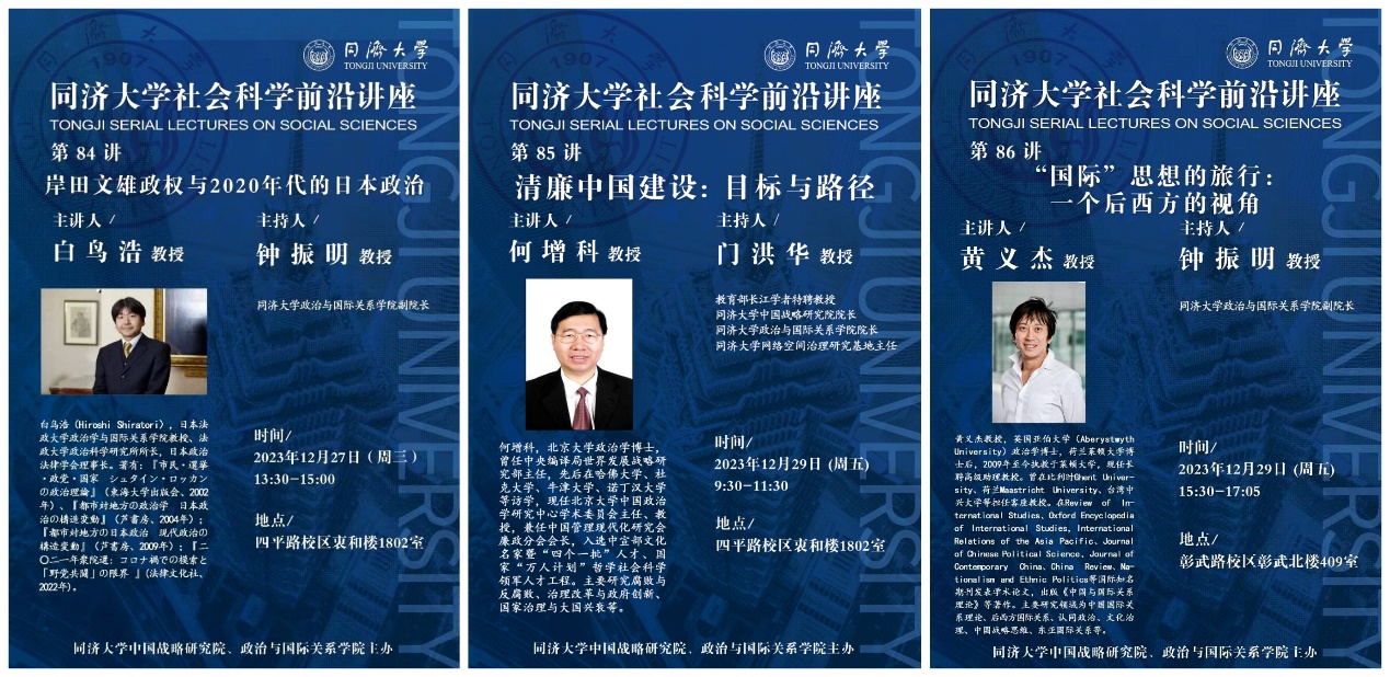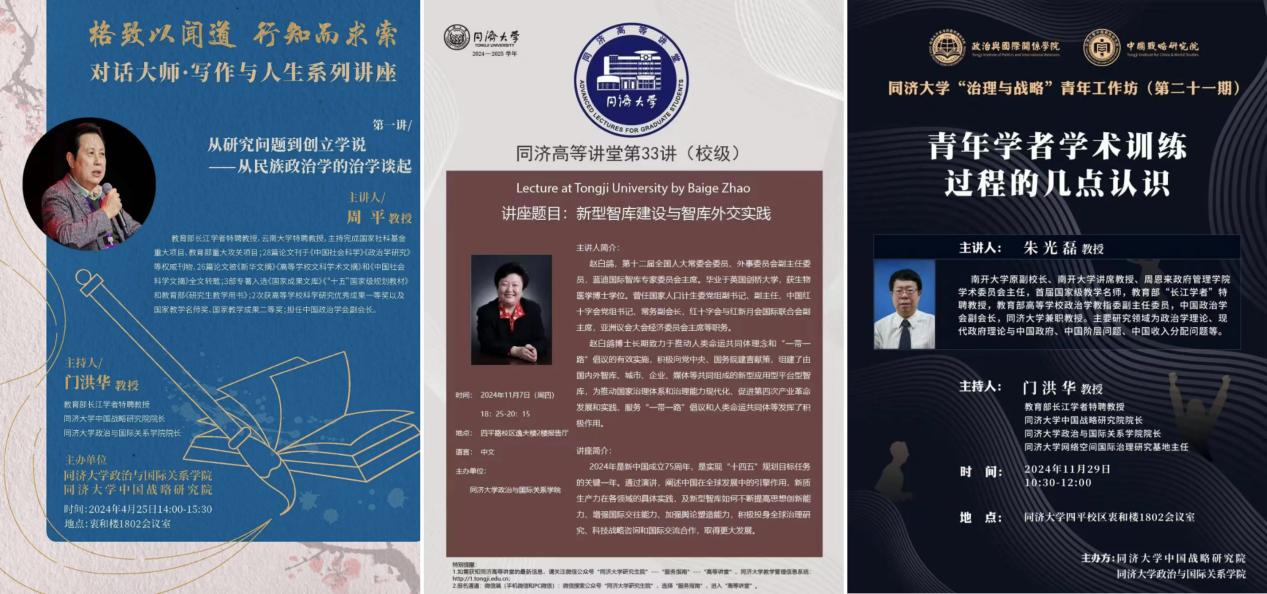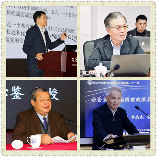 2017年10月29日,中国政治学会副会长、教育部高等学校政治学学科教学指导委员会副主任委员、教育部“长江学者”特聘教授、吉林大学社会公正与政府治理研究中心主任周光辉教授,受邀发表题为“社会公正与国家治理现代化”的精彩讲座,将政治学理论和中国政策现实进行了具有创新性的结合。2017年11月6日,原中国人民大学国际关系学院副院长,马克思主义理论教材工程《当代中国外交》首席专家,北京市高校国际政治研究会理事长、全国高校国际政治研究会常务理事李宝俊教授,受邀为同济大学师生带来了题为“走近世界舞台中央——中国特色大国外交”的精彩讲座,就党的十九大报告关于中国外交的内容进行了专业的分析和解读。2017年11月10日,中国社会科学院学部委员、国际学部主任张蕴岭教授受邀发表题为“周边关系:重建与重构”的讲座,通过对周边关系的历史与理论分析,阐述了中国周边外交战略的现状与未来。2017年11月10日,中国社会科学院亚太与全球战略研究院院长、中国社会科学院大学特聘教授李向阳教授,则带来了“‘一带一路’的进展与发展方向”的主题演讲,从国家战略和政策分析的视角,谈及了对于“一带一路”的深刻理解。2017年11月13日,兰州大学原副校长、全国高校国际政治研究会副理事长、教育部上海合作组织教育专家杨恕教授举行题为“全球反恐形势评估”的学术讲座,结合他在反恐问题上持续关注,为在场师生进行了全面的介绍与分析。