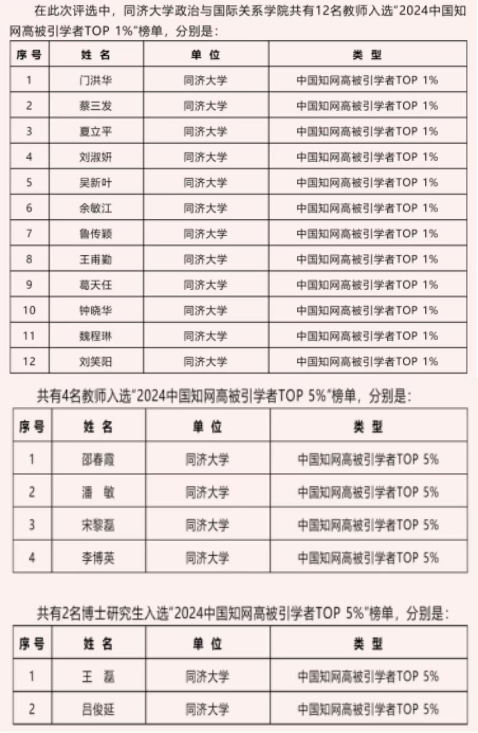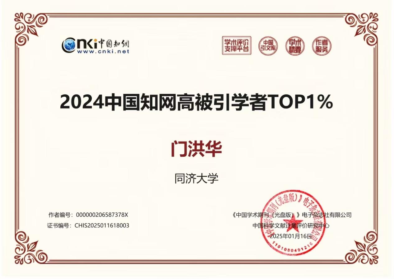 202412月底,中国知网中国科学文献计量评价研究中心基于中国知网收录的国内学术期刊论文和会议论文,首次公布了2024中国知网高被引学者”名单。在此次评选中,同济大学星空足球共有12名教师入选2024中国知网高被引学者TOP1%榜单,共有4名教师入选2024中国知网高被引学者TOP5%榜单,共有2名博士研究生入选2024中国知网高被引学者TOP5%榜单。