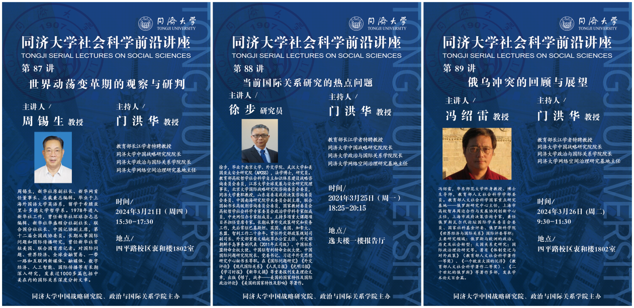 321日,新华社原副社长周锡生教授围绕“世界动荡变革期的观察与研判”展开主题演讲,向在场师生分析了当前世界百年未有之大变局的特点和中国的战略应对。325日,中国国际问题研究院原党委书记兼院长、中国原驻东盟使团团长兼大使、中国原驻智利大使徐步研究员受邀为同济师生作题为“当前国际关系研究的热点问题”的主题演讲,深入分析了当前国际局势和中国的政策方向,并在此基础上提出了当前国际关系研究的热点问题。326日,华东师范大学终身教授、教育部人文社会科学学部委员、教育部人文社会科学国家重点研究基地俄罗斯研究中心主任冯绍雷教授受邀以“俄乌冲突的回顾与展望”为主题,对俄乌冲突发生背景、现状及国际学界对冲突的看法、冲突形势的展望及未来国际秩序走向等方面进行了全面分析。