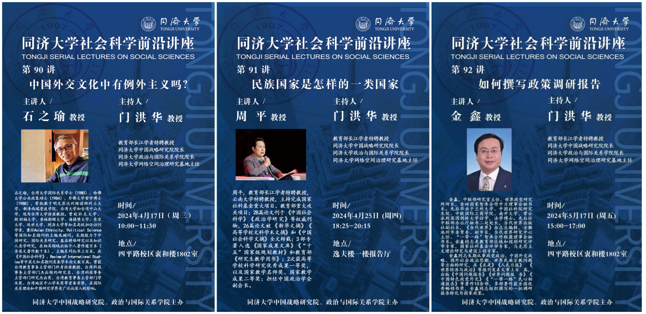 417日,台湾大学石之瑜教授受邀为同济师生作题为“中国外交文化中有例外主义吗?”的主题演讲,对例外主义的内涵、当前学界对例外主义研究的偏误、中西例外主义的对比等方面展开详细讲解。425日,教育部长江学者特聘教授、中国政治学学会副会长、云南大学特聘教授周平教授以“民族国家是怎样的一类国家”为主题,对民族国家的定义、起源以及当前发展面临的问题等议题为同济师生展开详细讲解。517日,中联部研究室主任、世界政党研究所所长、金砖国家智库合作中方理事会秘书长金鑫教授受邀以“如何撰写政策调研报告”为主题,对政策报告的结构、撰写要点与核心等问题进行分享。