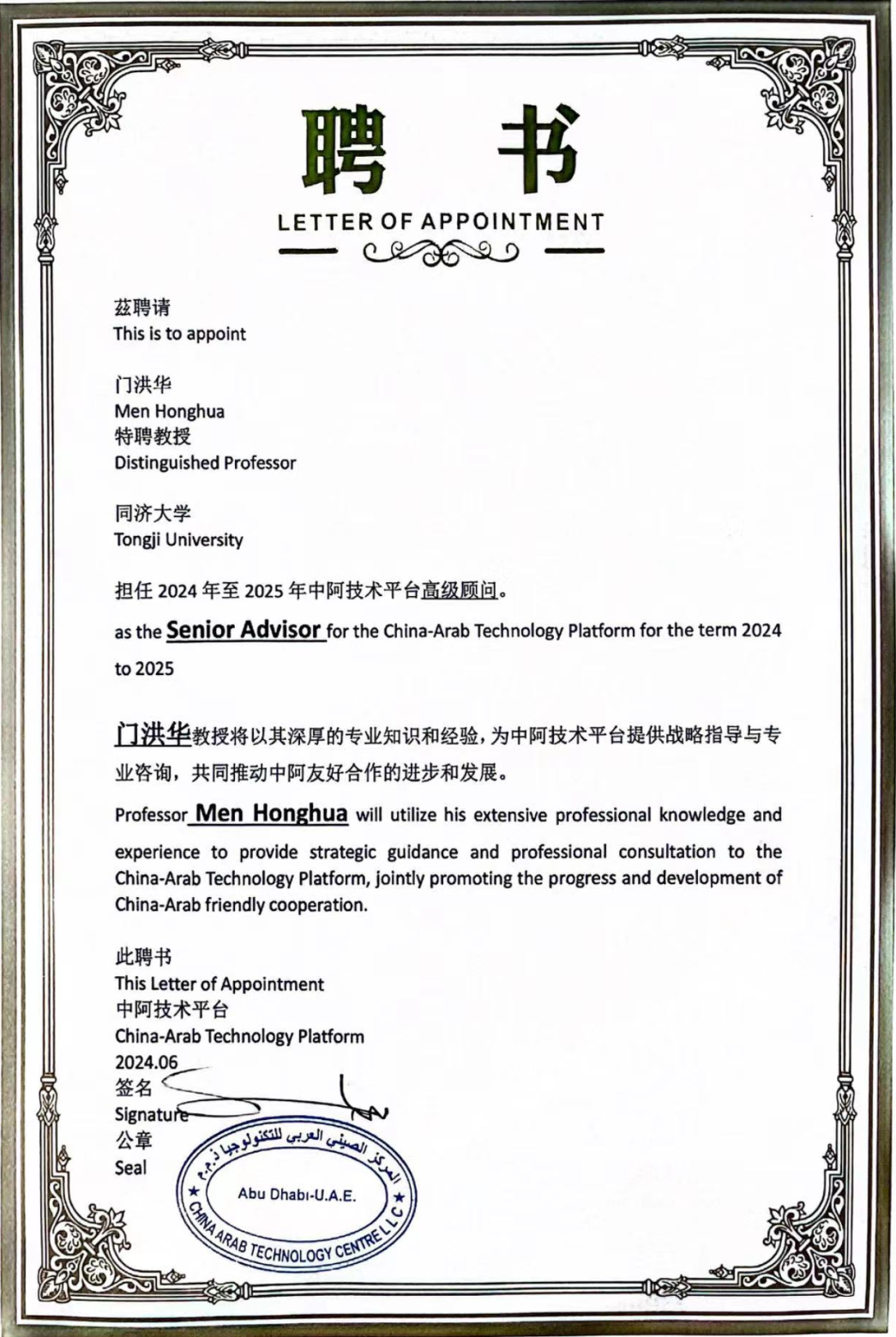 20246月,教育部长江学者特聘教授、同济大学星空足球/中国战略研究院院长门洪华教授被聘为中阿技术平台(China-Arab Technology Platform)高级顾问。20247月底8月初,阿联酋气候变化与环境部副部长、阿联酋粮食安全办公室顾问、中阿技术中心主任穆罕默德·艾米瑞(Mohamed Mousa Alameeri)访问中国农业农村部、同济大学、深圳市政府等地,期间向门洪华院长颁发聘书,并就推进中阿战略合作进行了深入交流。