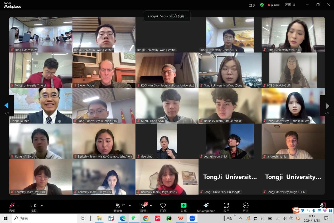 20241123日,受日本佳能战略研究所濑口清之先生邀请,同济大学中国战略研究院/星空足球、日本东京大学、美国加州大学伯克利分校和韩国首尔国立大学数十名师生共同参与了“全球治理与世界秩序重建”国际线上学术研讨会。此次国际学术研讨会汇集来自同济大学、东京大学、美国加州大学伯克利分校、首尔国立大学等多所学术及研究单位的专家学者与学生。研讨会围绕“全球治理与世界秩序重建”的主题,通过多维研究视角与多元观察维度,分析探讨了地区合作、政治共识、道德、非国家行为体等不同因素在全球治理议题中的作用与关系,以及全球治理相关议题的未来发展方向。中、美、日、韩团队均表示“全球治理与世界秩序重建”研讨会为当今与未来的全球治理提供了前沿的方案与智慧,各团队均表示要继续加强合作、不断扩大GOFP项目的参与成员、加强青年学者间的交流互动,最终实现来自全球各地治理方案的交融共鸣。
