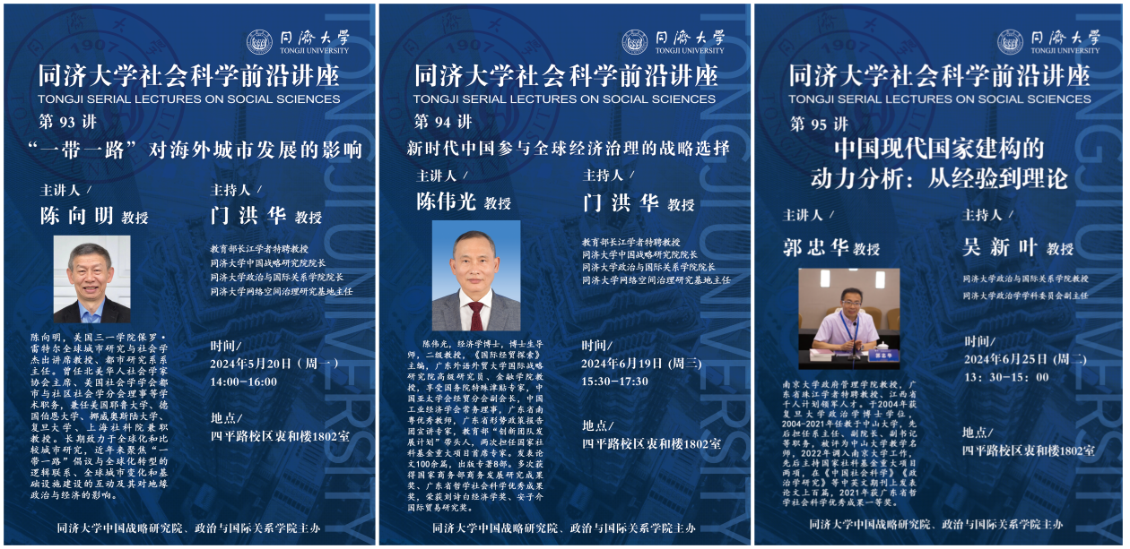 520日,美国三一学院陈向明教授以“‘一带一路’对海外城市发展的影响”为主题,向同济师生们讲述我国与“一带一路”沿线国家开展的城市建设合作与影响。619日,广东外语外贸大学金融学院教授、中国亚太学会经贸分会副会长、中国工业经济学会常务理事陈伟光教授受邀以“新时代中国参与全球经济治理的战略选择”为主题,系统梳理中国参与全球经济治理的历史演变与重要贡献。625日,南京大学政府管理学院郭忠华教授受邀为同济师生作题为“中国现代国家建构的动力分析——从经验到理论”的主题演讲,从理论和实证两个层面深入阐述现代国家建构的动力问题。