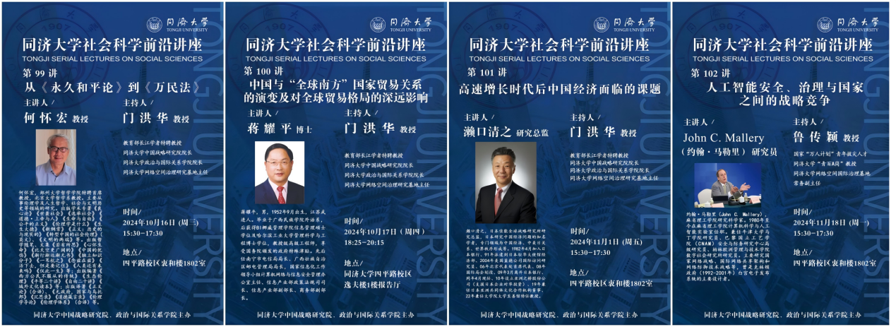 1016日,北京大学哲学系何怀宏教授受邀开展“从《永久和平论》到《万民法》”的主题讲座,对康德的两部著作进行细致解读。1017日,商务部原副部长将耀平博士受邀为同济师生作题为“中国与‘全球南方’国家贸易关系的演变及对全球贸易格局的深远影响”的主题演讲,详细讲述中国与“全球南方”国家贸易关系演变的历史及其重要意义。111日,日本佳能全球战略研究所研究总监濑口清之先生受邀开展以“高速增长时代后中国经济面临的课题”为主题的讲座,对目前的中国经济现状、外资企业对华投资、世界大变局之下的中日合作三个方面展开深入讲解。1118日,麻省理工学院研究科学家约翰·马勒里(John C .Mallery)受邀作“人工智能安全、治理与国家之间的战略竞争”主题讲座,深入分析人工智能治理的国际经验以及大国人工智能战略竞争的现状。