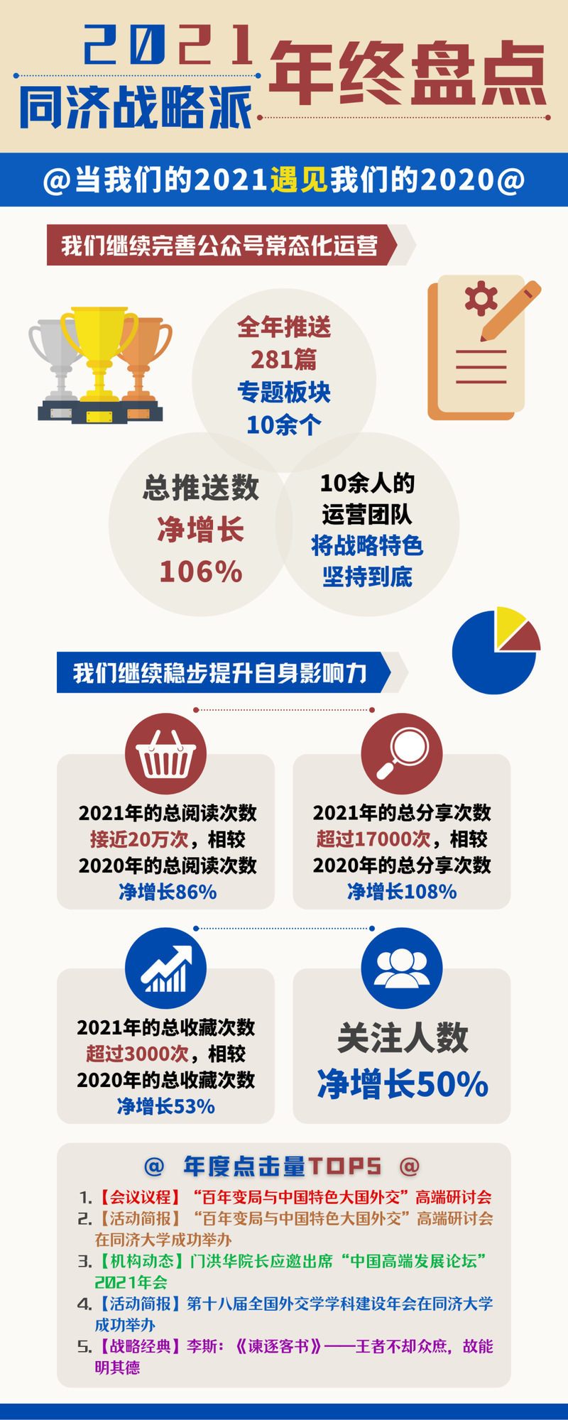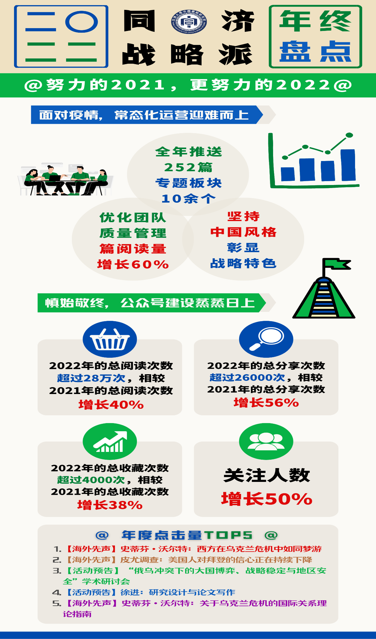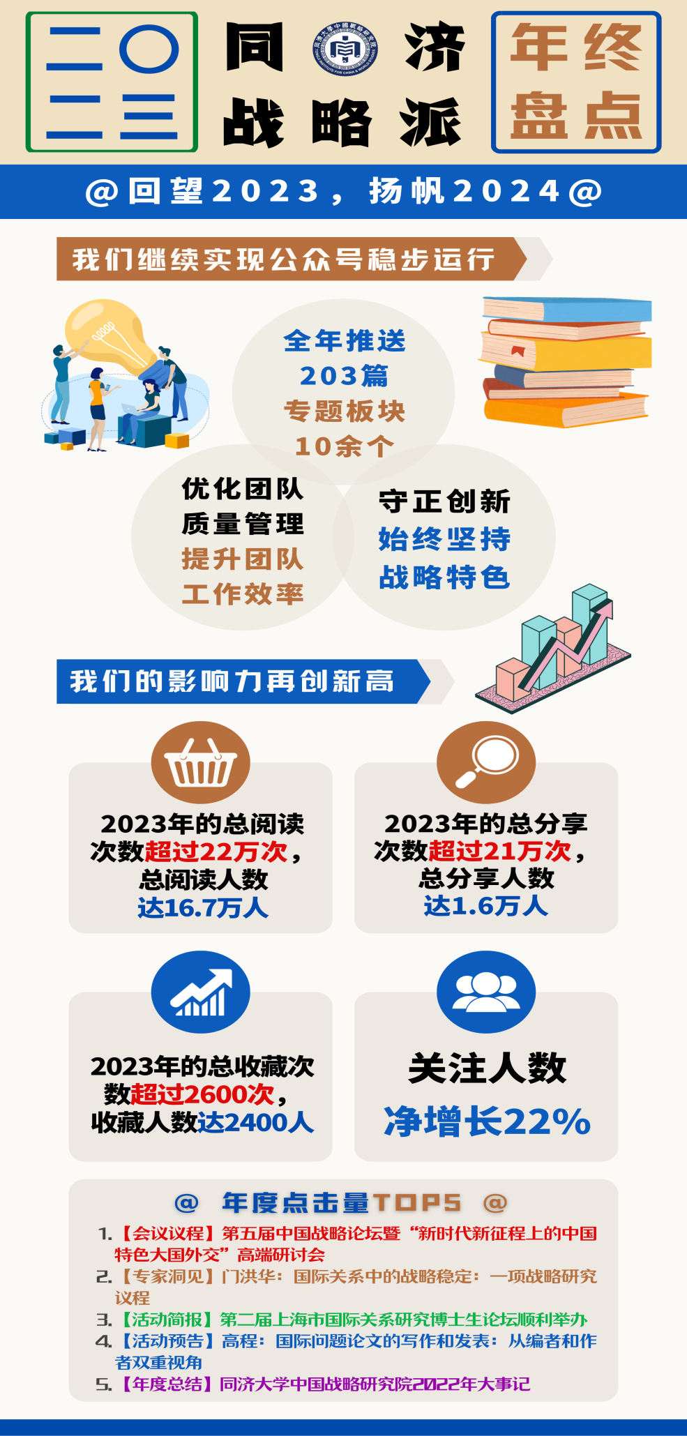 在宣传平台方面同济大学中国战略研究院主持的“同济战略派”公众号在2023年团队不断壮大、运营稳步推进。2023年全年推送203篇文章,总阅读人数达16.7万人,通过10余个内容丰富的专题板块坚持中国风格、彰显战略特色。据统计,2023年“同济战略派”关注人数增长22%、总阅读量超过22万人次、总分享次数超过21万人次、总收藏次数超过2600次。回望2023年,同济战略派步履铿锵。展望2024年,同济战略派踔厉奋发,力争打造“中国本位、战略特色”的宣传平台。