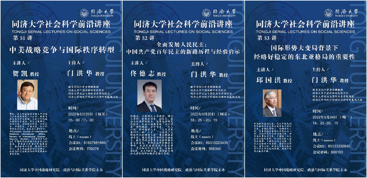520日,澳大利亚格里菲斯大学治理与公共政策研究中心主任、政府与国际关系学院贺凯教授以“中美战略竞争与国际秩序转型”为主题,从学理层面对国际秩序转型的衡量标准进行了创新性解释,并深刻总结了中国崛起与国际秩序转型的关系以及中美竞争对国际秩序转型的影响等问题。520日,教育部长江学者特聘教授、天津师范大学副校长佟德志教授受邀为同济师生做题为“全面发展人民民主:中国共产党百年民主的新路历程与经验启示”的学术演讲,从“中国民主的新路历程”“中国民主的经验启示”、“全面发展人民民主”等方面对全面发展人民民主进行了系统阐述。524日,中国前驻韩国大使邱国洪先生聚焦“国际形势大变局背景下经略稳定好东北亚格局的重要性”展开主题演讲,围绕国际形势的大变局、影响东北亚格局演变的主要因素、如何经略好稳定的东北亚格局等问题进行了丝丝入扣的详细讲解