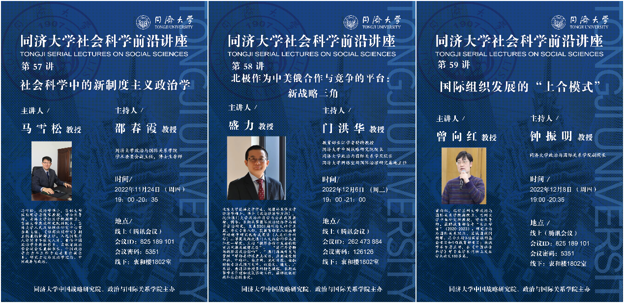 1124日,国家万人计划青年拔尖人才入选者、吉林大学匡亚明学者领军教授、吉林大学行政学院副院长马雪松教授以“社会科学中的新制度主义政治学”为主题,清晰地勾勒出了制度主义政治学由“旧”到“新”流转嬗变的理论背景,完整地展现出了新制度主义政治学各流派与问题矩阵中的脉络联系,审慎瞻望了新制度主义政治学的发展前景与研究方法的迭代更新。126日,澳门大学政治经济学与公共政策系盛力教授受邀为同济师生做题“北极作为中美俄合作与竞争的平台:新战略三角”的学术演讲,从“北极地区新战略三角的兴起”“中俄北极合作的基础和挑战”“中美俄在北极问题上的对立”“北极航线面临的挑战”等方面探讨了当今北极作为中美俄合作与竞争平台的现实问题与未来前景。128日,教育部青年长江学者、兰州大学星空足球副院长曾向红教授围绕“国际组织发展的‘上合模式’”,从上合组织组织安排和成员国制度运作手段等角度出发分析了国际组织发展的“上合模式”的深刻内涵及其运行逻辑。