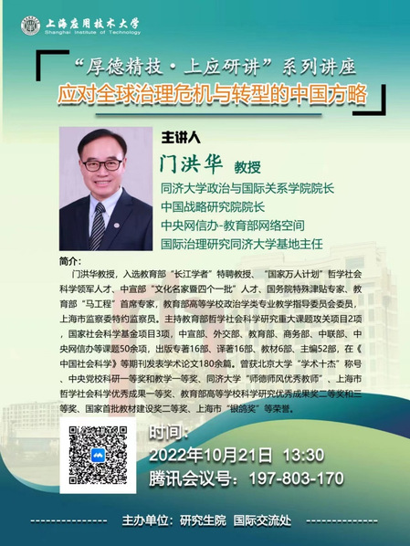 2017年7月8日,由上海社会科学院国际问题研究所主办的“第九届上海全球问题青年论坛暨第一届国际关系青年学人优秀论文奖颁奖仪式”在上海社会科学院举行。同济大学中国战略研究院院长门洪华教授应邀为本届论坛做时间为1小时的开幕演讲,演讲主题为“应对全球治理危机的中国方案”。门洪华教授从全球治理危机应对的历史与理论;当前全球治理危机与应对;中国应对全球治理危机的战略举措;中国推动全球治理转型发展的战略取向四个方面进行了系统阐述。11月2日上午,同济大学星空足球、中国战略研究院院长门洪华教授受邀为西南大学师生作题为“应对全球治理危机与变革的中国方略”的专题报告。此后,门洪华教授还同西南大学师生进行了互动交流,在场听众提问踊跃、反响积极。