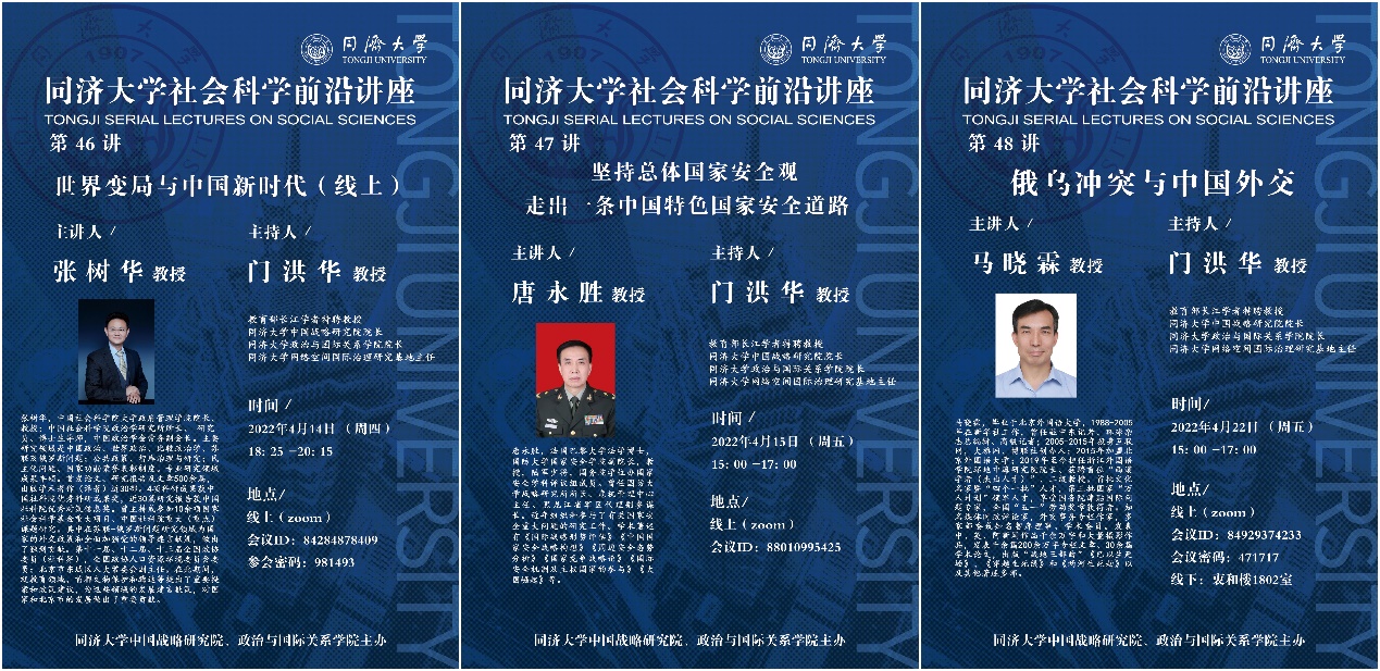 414日,中国政治学会常务副会长、中国社会科学院大学政府管理学院院长、中国社会科学院政治学研究所所长张树华教授以“世界之变与中国之治”为主题,阐述了当今世界政治大变局的政治态势以及世界政治视野中的中国之治。415日,中国人民解放军国防大学国家安全学院副院长、国务院学位办国家安全学科评议组成员唐永胜少将受邀为同济师生做题为“坚持总体国家安全观 走出一条中国特色国家安全道路”的学术演讲,就总体国家安全观的时代条件、核心要义与实践要求等方面进行了权威讲解。422日,全国“五一”劳动奖章获得者、国家万人计划哲学社会科学领军人才入选者、浙江外国语学院环地中海研究院院长马晓霖教授围绕“俄乌冲突与中国外交”展开主旨演讲,从俄乌历史的“恩怨情仇”、俄乌冲突的现实原因以及未来的俄乌美欧关系进行了鞭辟入里的解答。