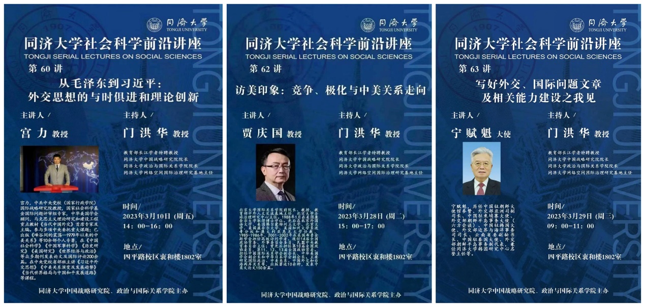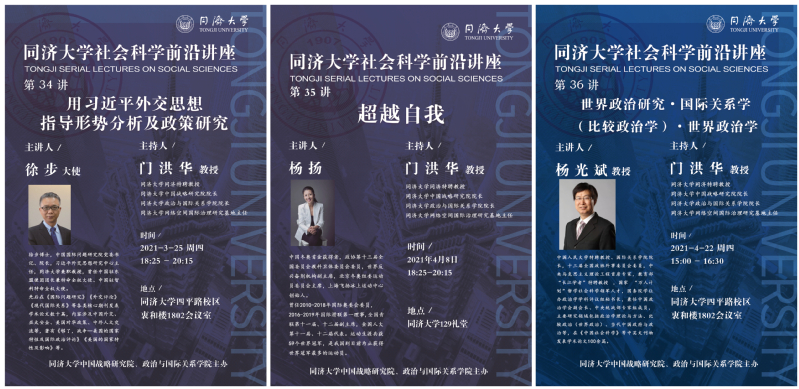 10月11日,中国社会科学院学部委员张蕴岭研究员以“百年变局与中国”为题,围绕提及“百年变局”的原因、“百年变局”的内涵以及“百年变局”的走向等核心问题,为同济师生展示了对中国与世界关系的战略观察;11月16日,中国现代国际关系研究院副院长冯仲平研究员以“欧洲一体化面临的挑战及发展前景”为题,从当前欧洲一体化面临的挑战、欧洲一体化受挫的原因、欧盟发展的前景及国际地位以及中欧关系等方面系统进行了系统阐述;11月26日,国家海洋局海洋发展战略研究所所长、第十三届全国政协委员张海文研究员以“全球海洋治理的热点问题”为题,就全球海洋治理的相关内涵、核心问题以及中国在国际海洋治理领域的理念行动进行了专业而详实的介绍;12月21日,中国社会科学院亚太与全球战略研究院研究员、《当代亚太》执行主编高程以“中美竞争背景下的中美关系和中国周边经营”为题,结合近期中美关系呈现出的新变化和新趋势,为同济师生介绍了自身对中国周边外交的理解和判断;12月28日,第十二届全国政协经济委员会驻会副主任、中国产学研合作促进会副会长石军教授以“中国经济体制转型方法论”为题,结合自身丰富的经济工作实践,从经济体制转型的动力、方法、原则和落实等方面,归纳总结了改革开放以来中国经济体制转型的基本经验。