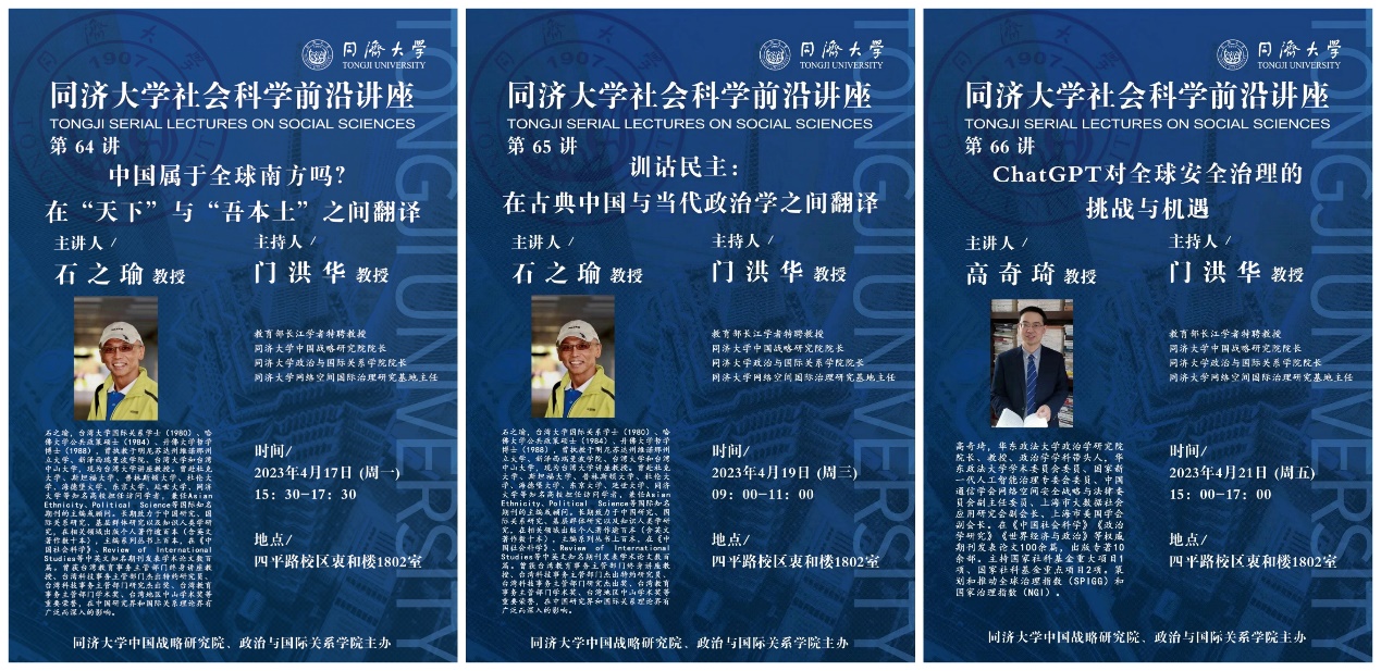 417日,台湾大学石之瑜教授受邀为同济师生作题为“中国属于全球南方吗?在‘天下’与‘吾本土’(Ubuntu)之间翻译”的学术演讲,阐述对西方国际关系理论再中心化现象的认识,并在此基础上分析了中国对全球南方的身份认同、全球南方文明中“天下”和“吾本土”的文化内涵及其对中国外交战略的启示。419日,石之瑜教授聚焦“训诂民主:在古典中国与当代政治学之间翻译”的主题,阐述政治学经典概念在不同框架下的理解。421日,华东政法大学政治学研究院院长、教授、政治学学科带头人高奇琦教授以“ChatGPT对全球安全治理的挑战与机遇”为主题,深入分析ChatGPT出现的背景及其对全球安全治理带来的挑战与机遇。