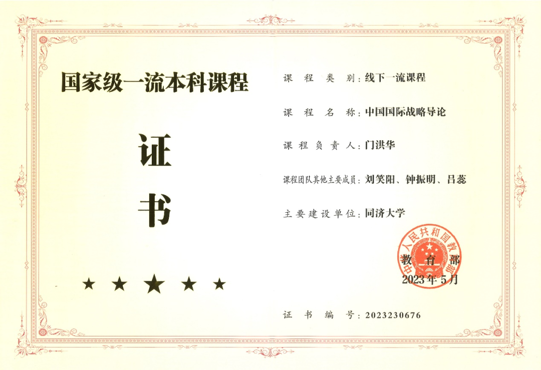 在学科建设方面20235月,教育部长江学者特聘教授、同济大学星空足球/中国战略研究院院长门洪华教授主讲的“中国国际战略导论”入选第二批国家级一流本科课程(线下课程)。这是继“中国国际战略导论”2021年入选“上海高等学校一流本科课程”之后,本课程再次取得的重大建设成果。