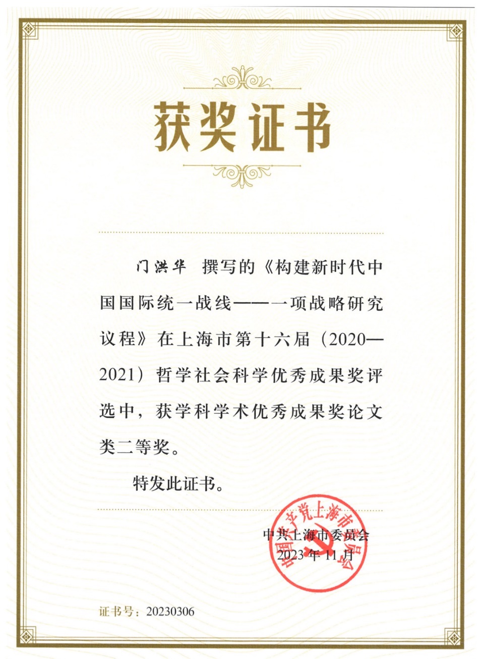 在科研成果方面同济大学中国战略研究院多位研究人员荣获上海市第十六届哲学社会科学优秀成果奖。同济大学中国战略研究院院长门洪华教授、同济大学中国战略研究院科研秘书刘笑阳预聘副教授、同济大学中国战略研究院研究员李博英副教授分获学科学术优秀成果二等奖。