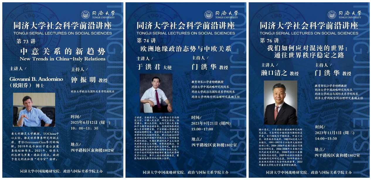 同济大学“中国与世界”名家讲座频繁开展。2016年3月17日,中华人民共和国驻东盟使团团长、特命全权大使徐步博士莅临同济大学,接受同济大学兼职教授聘书,并举行题为“一个资深外交官眼中的中国与世界”专题演讲,围绕当今中国与世界的关系进行了深刻而生动的分析。2016年10月23日,台湾大学石之瑜教授莅临同济大学,举行题为“中国学的知识社群研究:知识人类学倡议”的专题讲座,深入阐述了当代世界各主要国家和地区的中国学研究领域的发展脉络和思想史背景。2016年10月28日,日本佳能全球战略研究所研究总监濑口清之先生应邀出席讲座,并发表了题为“中国经济和日中关系的现状以及长期展望”的演讲,详细解读了中国的宏观经济形势,并对中日经济合作的未来提出了建设性的思考。2016年11月14日,美国宾夕法尼亚大学法学与政治学教授、宾夕法尼亚大学东亚研究中心主任戴杰教授(Jacques deLisle)莅临同济大学,为学校师生带来了题为“美国、中国与国际规范”的精彩演讲,从诸多中观层面深入剖析了国际秩序变革进程中的中美关系。