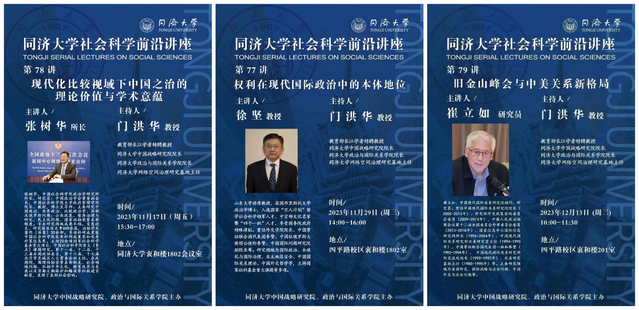 1117日,中国社会科学院政治学研究所所长、中国政治学会常务副会长、中国社会科学院大学政府管理学院院长张树华研究员以“现代化比较视域下中国之治的理论价值与学术意蕴”为主题,围绕新形势与新任务、哲学社会科学自主知识体系发展现状与分析、构建中国特色学术治理体系、中国之治与中国之学四个方面展开深入讲解。1129日,山东大学讲席教授、外交学院前院长、前中国驻联合国代表团参赞徐坚教授受邀为同济师生作题为“权利在现代国际政治中的本体地位”的学术演讲,从“权利”的基本概念出发,对其进行历史梳理、理论建构与国际比较。1213日,中国现代国际关系研究院前院长、外交部外交政策咨询委员会委员崔立如研究员受邀围绕“旧金山峰会与中美关系新格局”的主题,从战略格局的角度梳理了中美关系的脉络,并从国内政治视角剖析美国的政治、经济与安全战略的转变。