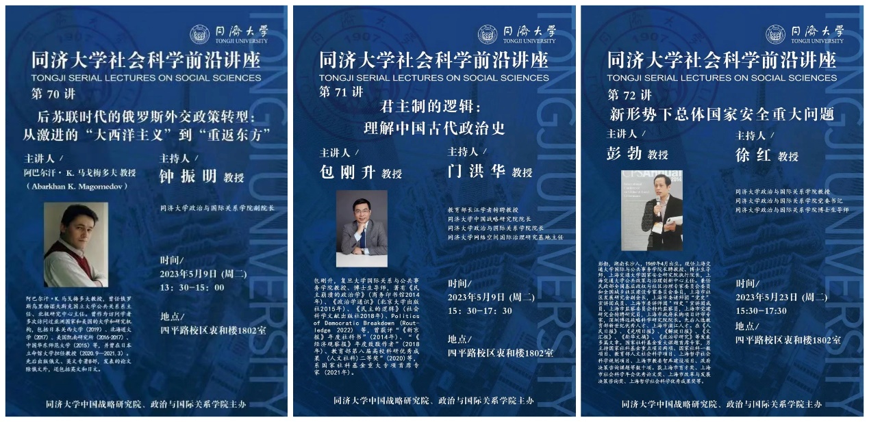 59日,俄罗斯乌里扬诺夫斯克国立大学公共关系系前主任、北极研究中心前主任阿巴尔汗·K.马戈梅多夫(Abarkhan K. Magomedov)教授受邀为同济师生作题为“后苏联时代的俄罗斯外交政策转型:从激进的‘大西洋主义’到‘重返东方’”的学术演讲。同日,复旦大学国际关系与公共事务学院教授、博士生导师包刚升教授围绕“君主制的逻辑:理解中国古代政治史”的主题,以君主制的运行与发展作为线索,系统阐述中国古代政治的发展脉络。523日,上海交通大学国际与公共事务学院长聘教授、博士生导师、上海交通大学国家安全研究院执行院长、上海交通大学公共政策与治理创新中心主任彭勃教授围绕“新形势下总体国家安全重大问题”的主题,对当前国际局势与我国总体国家安全面临的重大问题进行深刻分析。