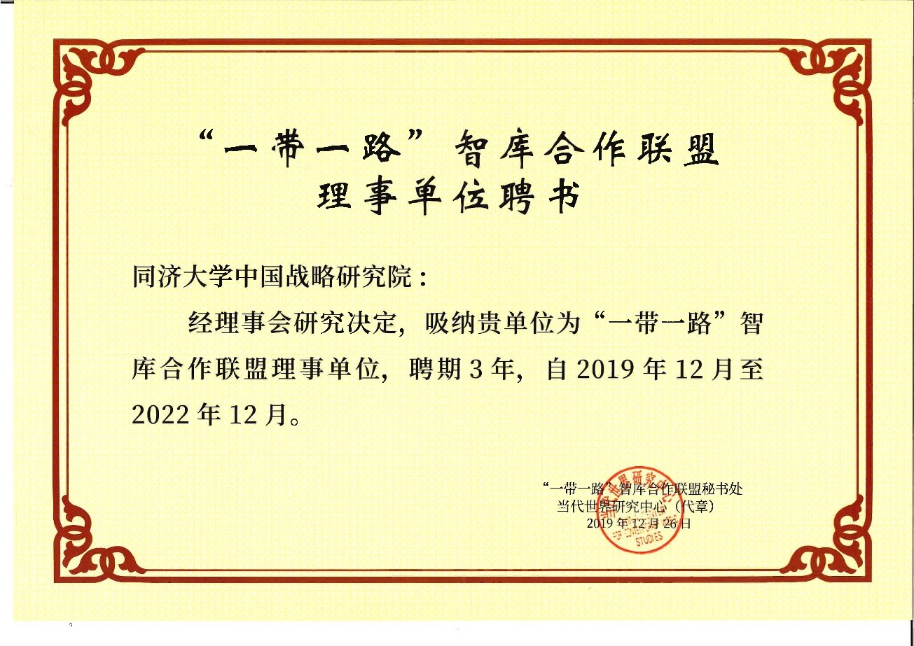同济大学中国战略研究院获评2019年度“一带一路”智库合作联盟优秀理事单位