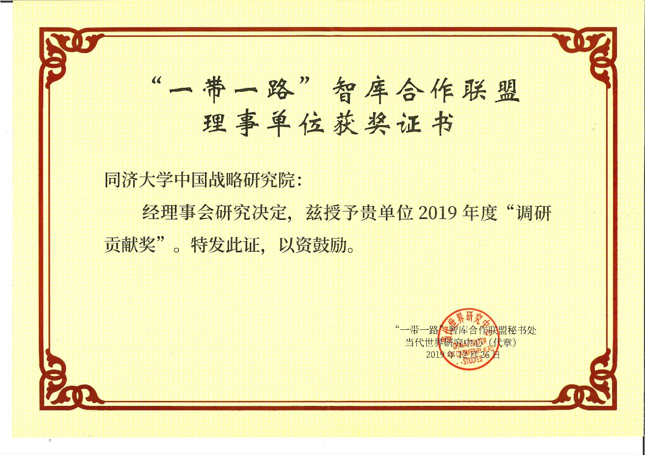 2019年12月26日,由中共中央对外联络部主办的“一带一路”高端智库论坛暨“一带一路”智库合作联盟理事会第五次会议在北京召开,本次会议以“高质量共建‘一带一路’:方向和路径”为主题,邀请来自全国近300家“一带一路”智库合作联盟理事单位的相关专家学者探讨新时代“一带一路”高质量发展的未来方向和有效路径,介绍了过去一年中“一带一路”智库合作联盟的代表活动和前沿成果。同时,“一带一路”智库合作联盟秘书处还在本次会议上宣布了本年度评选出的20家优秀理事单位(其中10家为“调研贡献奖”,10家为“品牌活动奖”),同济大学中国战略研究院荣获优秀理事单位“调研贡献奖”,位列第二名。