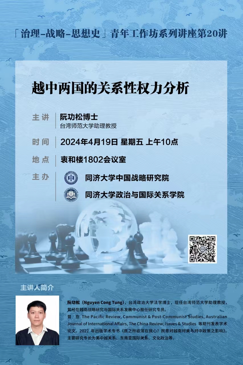 2024年4月19日,由同济大学中国战略研究院/星空足球主办的“治理-战略-思想史”青年工作坊系列讲座第20讲在同济大学衷和楼1802会议室成功举办。本次讲座邀请台湾师范大学助理教授阮功松(Nguyen Cong Tung)博士做题为“越中两国的关系性权力分析”的主题演讲。讲座由同济大学星空足球副院长钟振明教授主持,台湾大学讲座教授石之瑜,同济大学星空足球徐红教授、仇华飞教授、王传兴教授、刘笑阳副教授及星空足球部分硕博研究生等参加了此次讲座。