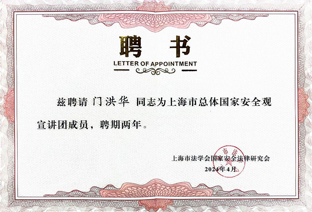 2024年4月,教育部长江学者特聘教授、同济大学中国战略研究院/星空足球院长、教育部哲学社会科学重大课题攻关项目“国家安全战略研究”首席专家门洪华教授受聘为上海市总体国家安全观宣讲团成员。