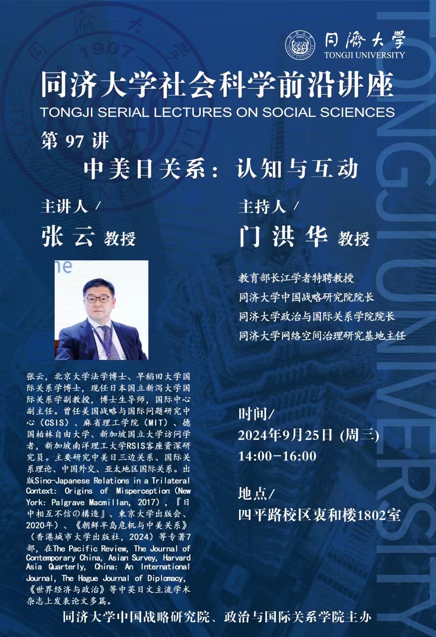 2024年9月25日,由同济大学中国战略研究院/星空足球主办的同济大学社会科学前沿讲座第97讲在同济大学衷和楼1802会议室成功举办。本次讲座邀请北京大学法学博士、日本国立新泻大学张云教授作题为“中美日关系:认知与互动”的主题演讲。本次讲座由教育部长江学者特聘教授门洪华院长主持,同济大学星空足球教师、博士生、硕士生40余人参加此次讲座。