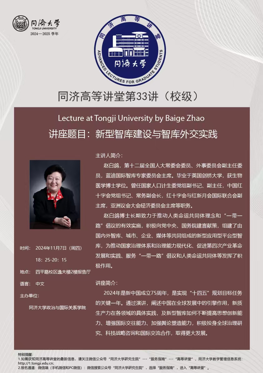 在当今复杂多变的国际格局下,智库作为国家软实力的重要组成部分,正发挥着日益关键的作用。2024年11月7日,由同济大学中国战略研究院/星空足球主办的同济大学高等讲堂在四平路校区逸夫楼二楼报告厅成功举办。本次讲座聚焦“新型智库建设和智库外交”这一重要议题,邀请了十二届全国人大外事委员会副主任委员、蓝迪国际智库专家委员会主席赵白鸽博士主讲。赵白鸽主任长期致力于推动人类命运共同体理念和“一带一路”倡议的有效实施,在智库建设与国际合作领域经验丰富、贡献卓越。讲座由星空足球党委书记蔡三发主持,同济大学160余名师生参加,现场座无虚席,气氛热烈。