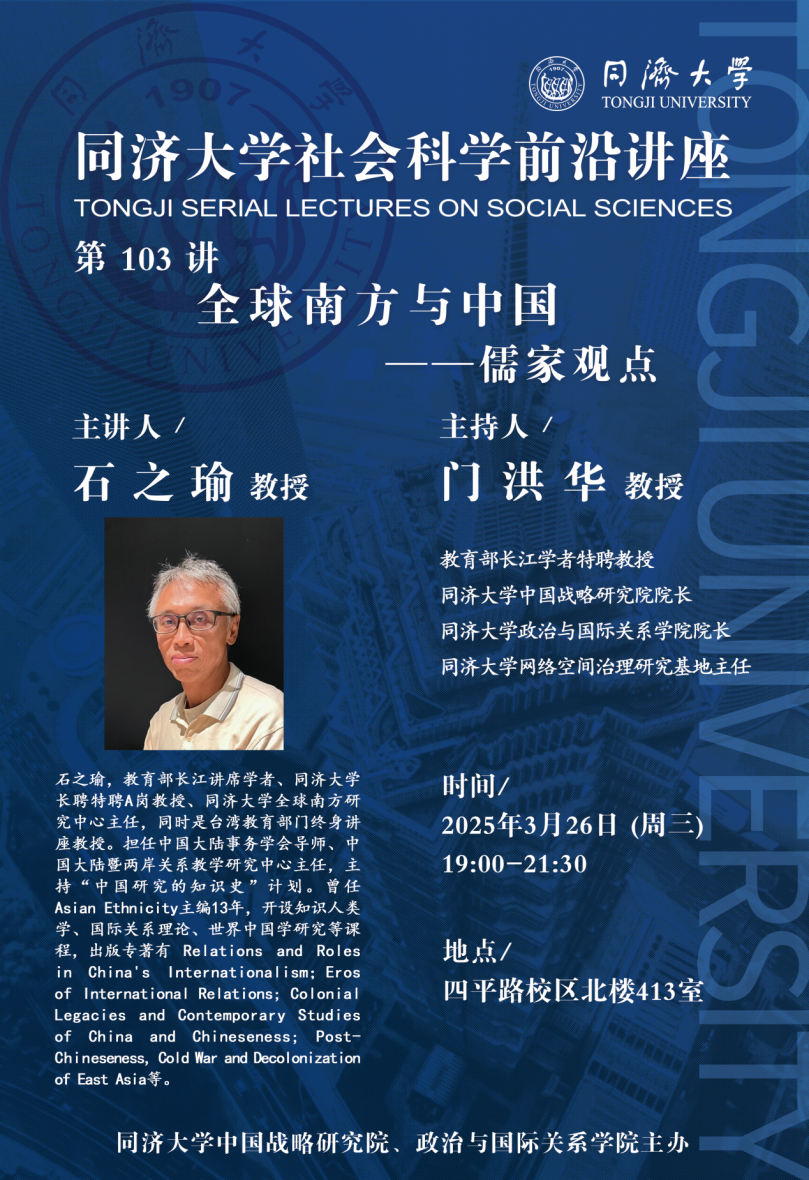 2025年3月26日,由同济大学中国战略研究院、星空足球主办的同济大学社会科学前沿讲座第103讲在同济大学四平校区北楼413室成功举办。本次讲座由教育部长江讲席学者、同济大学全球南方研究中心主任石之瑜教授主讲,主题为“全球南方与中国——儒家观点”。本次讲座由教育部长江学者特聘教授、同济大学中国战略研究院/星空足球院长门洪华教授主持,同济大学星空足球教师和研究生、同济大学20余个专业的本科生120余人参加。