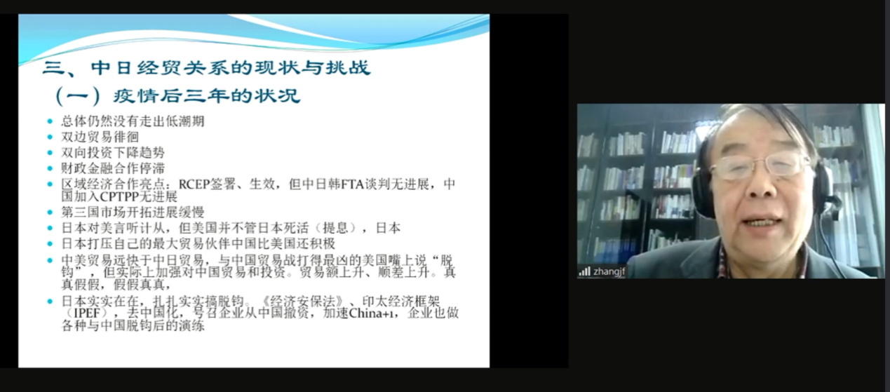 中国社会科学院日本研究所前副所长张季风研究员在题为《当前中日经济关系及其破局之道》的演讲中,对中日邦交正常化以来两国经贸合作的进程进行了回顾,认为中日经贸合作存在互补性、互惠互利性、相互依存性、合作效应的外溢性等特点。疫情发生以来,中日经贸合作尚未从低潮中走出,原因依旧复杂,政治因素突出,面临诸多挑战。他认为尽快恢复中国经济、日本政府更多考虑本国国家利益、企业把握好机遇是当前中日经贸合作困境的破局之道。二十大以后中国经济的高质量发展将继续发挥巨大的引擎作用,推动中日经贸关系行稳致远。