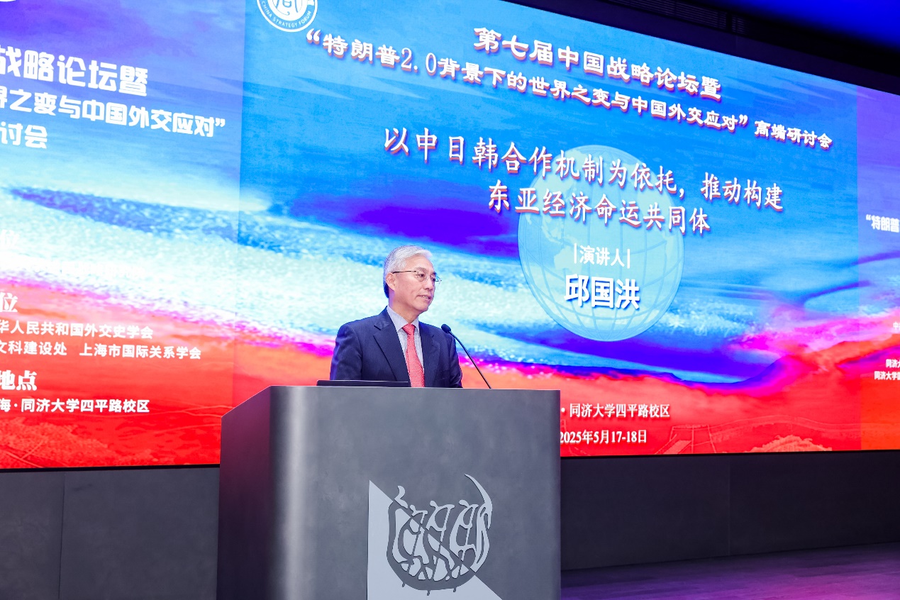 外交部前驻韩国大使、前驻尼泊尔大使邱国洪就中日韩合作进行了主旨演讲。邱国洪大使强调了中日韩在面对美国的高关税政策时,有必要通过深化区域合作来稳定经济增长,构建东亚经济命运共同体。邱国洪大使认为,因为中日韩三国在维护多边自由贸易体制和应对高关税方面存在共同利益,所以要稳住中日、中韩和韩日的双边关系,尤其是恢复高层交流以减少政治因素对经贸合作的负面影响。最后,邱国洪大使建议加强经济和人文交流,改善国民感情促进合作;各国政府要支持中小企业在区域合作平台下的发展,帮助其适应新的市场环境;中日韩三国要通过建立区域级别的创新创业平台,以帮助年轻人应对就业挑战。最后他总结表示中国需要制定长期战略,抵御美国的控制政策,推动构建具有中国特色的周边战略。