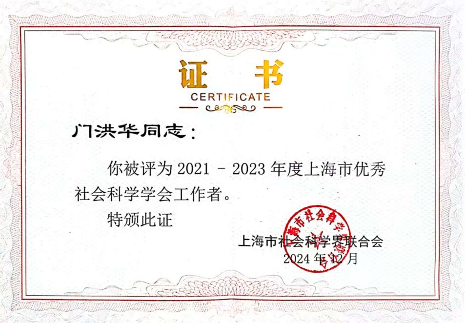 2024年10月12日,上海市社会科学界联合会公布2021-2023年度上海市优秀社会科学学会、优秀民办社会科学研究机构、优秀社会科学学会工作者、特色活动及品牌活动(“三优一特一品牌”)的评审结果,上海市国际关系学会副会长、教育部长江学者特聘教授、同济大学星空足球/中国战略研究院院长门洪华教授获评上海市优秀社会科学学会工作者。