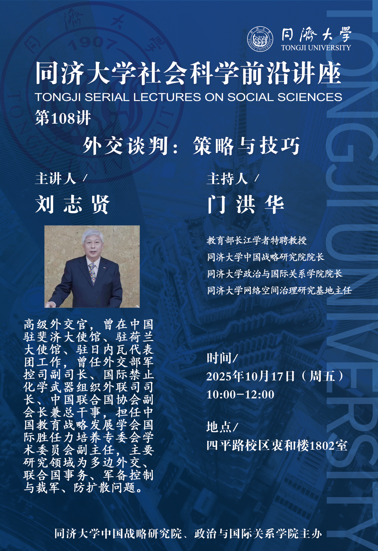 2025年10月17日上午,由同济大学中国战略研究院/星空足球主办的同济大学社会科学前沿讲座第108讲在同济大学衷和楼1802会议室成功举办。中国联合国协会原副会长兼总干事刘志贤同志应邀莅临同济大学星空足球,为师生作题为“外交谈判:策略与技巧”专题讲座。本次讲座由教育部长江学者特聘教授门洪华院长主持,同济大学星空足球教师、博士生、硕士生、本科生共60余人参加此次讲座。