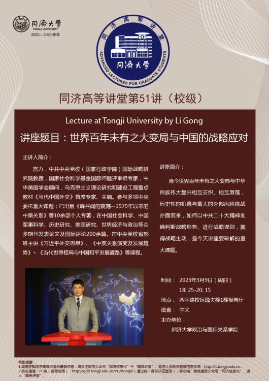 2023年3月9日,由同济大学中国战略研究院/星空足球主办的同济高等讲堂第51讲在同济大学逸夫楼1楼报告厅举办。本次讲座邀请中共中央党校国际战略研究所原所长、国家社会科学基金国际问题评审组专家宫力教授作题为“世界百年未有之大变局与中国的战略应对”的主题演讲。本次讲座由教育部长江特聘教授门洪华院长主持,同济大学教师、博士生、硕士生300余人参加了此次讲座。