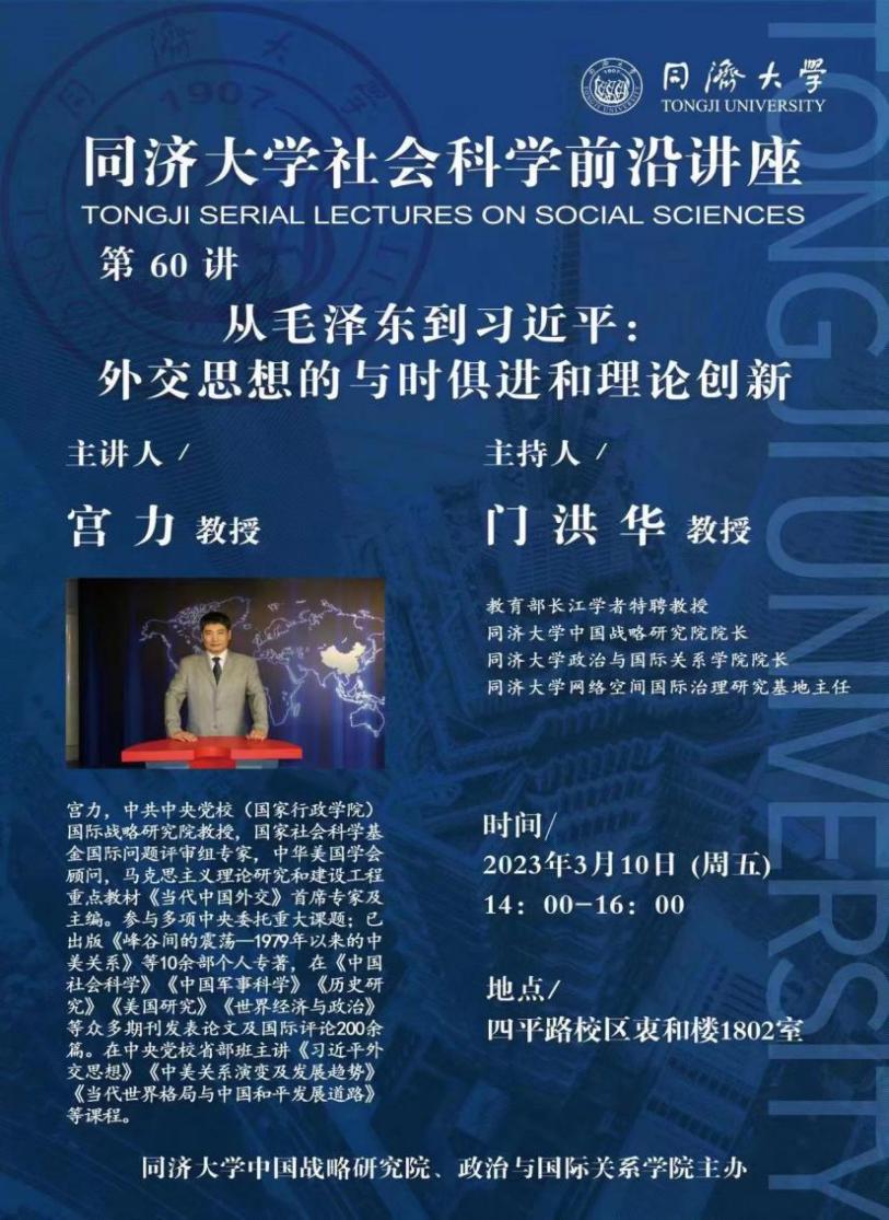 2023年3月10日,由同济大学中国战略研究院/星空足球主办的同济大学社会科学前沿讲座第60讲,在同济大学衷和楼1802会议室成功举办。本次讲座邀请中共中央党校国际战略研究所原所长、国家社会科学基金国际问题评审组专家宫力教授作题为“从毛泽东到习近平:外交思想的与时俱进和理论创新”的主题演讲。本次讲座由教育部长江学者特聘教授门洪华院长主持,同济大学星空足球教师、博士生、硕士生60余人参加了此次讲座。