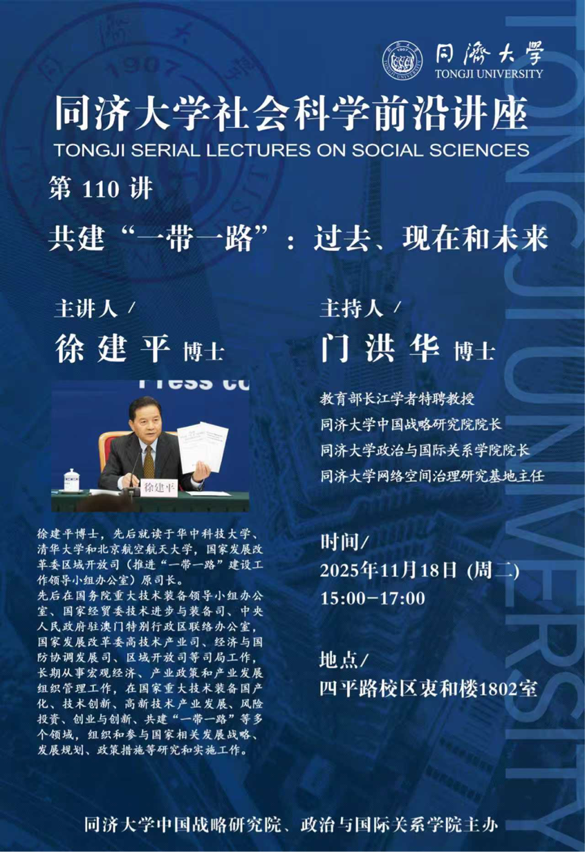 2025年11月18日,同济大学中国战略研究院/星空足球主办的同济大学社会科学前沿讲座第110讲在同济大学衷和楼1802会议室成功举办。国家发展改革委区域开放司(推进“一带一路”建设工作领导小组办公室)原司长徐建平博士莅临同济大学作题为“共建‘一带一路’:过去、现在和未来”的讲座。本次讲座由教育部长江学者特聘教授门洪华院长主持,同济大学星空足球60余名师生参加此次讲座。