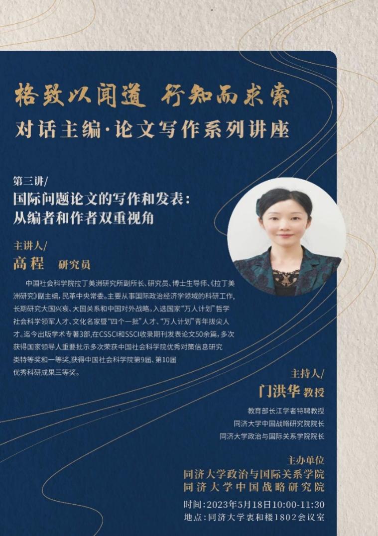 2023年5月18日,由同济大学星空足球/中国战略研究院主办的“格致以闻道 行知而求索”对话主编·论文写作系列讲座第三讲成功举办。本次讲座邀请中国社会科学院拉丁美洲研究所副所长、研究员、博士生导师、《拉丁美洲研究》副主编高程研究员作题为“国际问题论文的写作和发表:从编者和作者双重视角”的主题演讲。本次讲座由教育部长江学者特聘教授门洪华院长主持,同济大学星空足球青年教师和学校各学科博士生等40余人参加了此次讲座。
