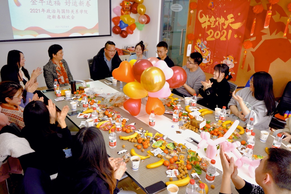师生们一起布置场地准备水果小吃,围坐桌前,共话新春。活动伊始,徐红书记向所有同学致以新春的祝福,并宽慰道,第一次在外过年是对自己人格独立的锻炼。希望各位同学要在做好自我防护的前提下,遵守学校各项规章制度,过一个平安温馨的“校园年”;科学规划时间,劳逸结合,合理安排学习科研与休闲娱乐时间;开阔眼界视野,调节心情状态,用自己的亲身体验感悟上海的春节氛围。学院会一直守护着大家,将关爱传递给每一位留校学生。